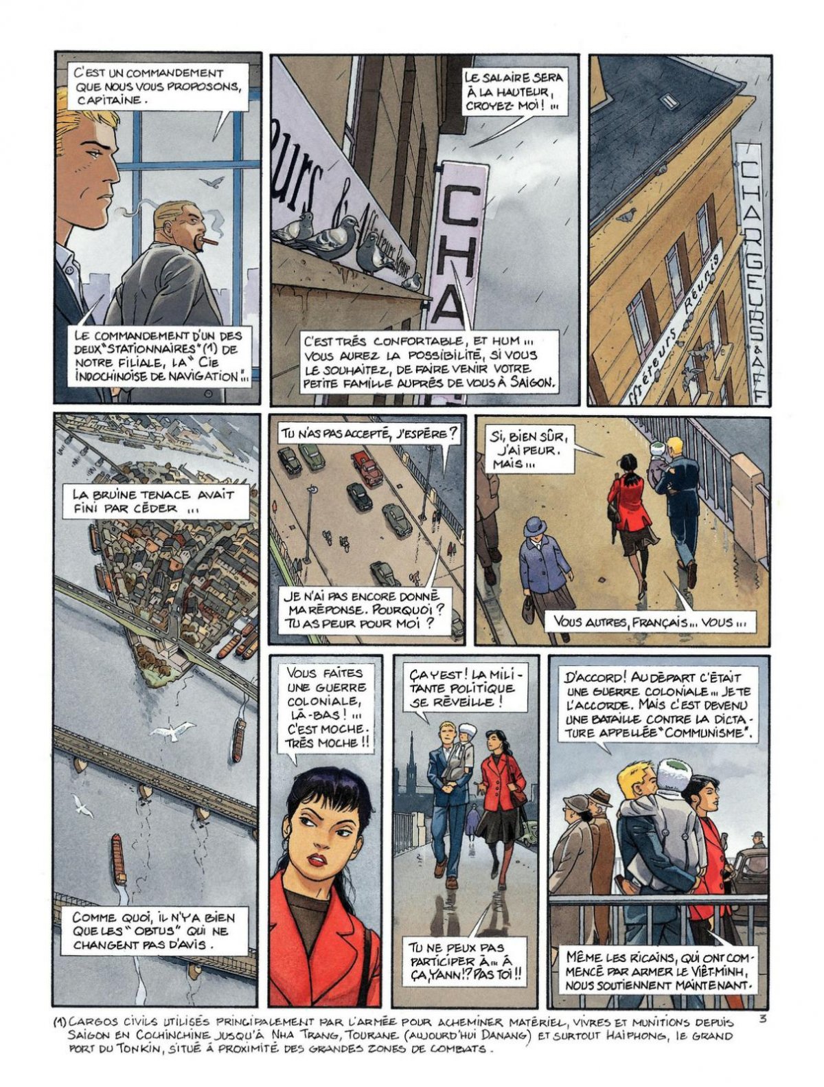 Yann Calec et Rosanna sont installés a Rouen en compagnie de leur fille, Ines. Pour Yann, l’urgence est de dénicher le commandement d’un "tramp". A force d’obstination, il trouvera finalement un poste en... Indochine. Probleme : c’est la guerre en Indochine. Une sale guerre, meme, mais la compagnie est prete a confier a Yann le commandement d’un navire basée a Saigon. Le salaire confortable fait réfléchir Yann, conscient des dangers encourus. Seulement Rosanna ne semble pas convaincue et se méfie de cette destination "exotique". La guerre coloniale qui fait rage la-bas ne l’incite guere a faire ce voyage mais Yann finit par accepter. Arrivé sur place, il découvre Saigon et un environnement pour le moins agité ou les combines sont monnaie courante, y compris a bord de son propre navire. Yann s’adapte peu a peu et découvrira surtout que son propre pere a laissé la-bas des traces de son passage. Un retour vers le passé débute alors.