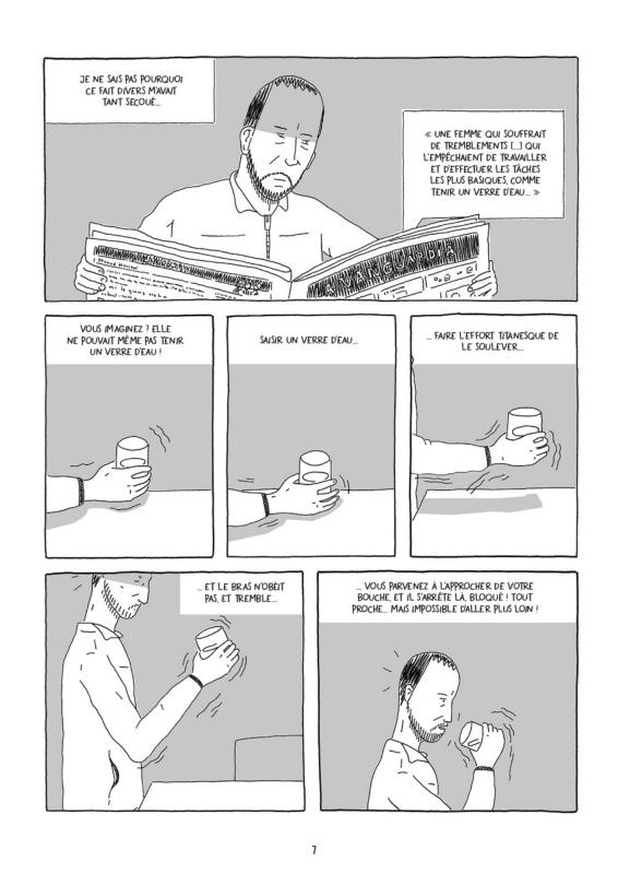 Tremble est le récit quotidien du combat contre une maladie neurodégénérative et de son acceptation, qui supposent également une réflexion personnelle sur la manière de mener cette nouvelle vie en compagnie de la maladie. Son trait simple accentue le ton désinvolte de l’auteur en quête de réponses à un futur incertain.