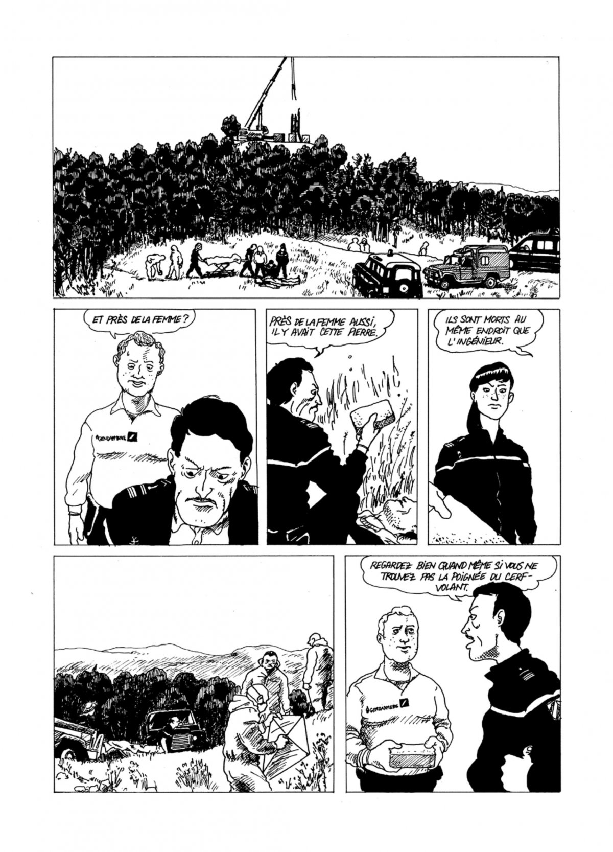 Alors qu’une nouvelle antenne-relais est en construction aux abords de la ville, des morts inexpliquées se multiplient. La thèse de l’accident est rapidement écartée car auprès de chaque victime, est retrouvée une pierre parallélépipédique qui semble relier les affaires entre elles. S’il s’agit bien de meurtres, l’identité et la motivation de leurs auteurs (un tueur en série, des opposants fanatiques au projet d’antenne-relais ?) restent mystérieuses. Mais pour les autorités légales, il s’agit de rationaliser, de trouver des causes, de protéger l’industrie des télécommunications et de dénicher des coupables. Entre un mari énigmatique et en retrait et ses collègues lourdauds, la gendarme Loreleï Soares se fie à son instinct pour faire avancer l’enquête dont les premiers suspects sont un sanglier et un lynx. S’agirait-il d’une nouvelle étape dans la guerre ancestrale entre l’homme et la nature ? Auteur de nombreux ouvrages singuliers (chez Atrabile ou la Cinquième Couche entre autres), Thomas Gosselin s’associe à Isao Moutte au dessin pour ce polar énigmatique qui questionne habilement les rapports entre l’homme et la nature, la fragilité de leur cohabitation, les luttes de pouvoir et l’équilibre des forces. Entre scènes d’action et pages contemplatives, La trêve, chérie livre un épisode tendu de ce face-à-face éternel et sans pitié. Le thème du rapport entre l’homme et la nature a été de nombreuses fois traité mais La trêve, chérie propose une tout autre approche. Construit sous la forme d’une enquête policière, le récit change régulièrement de rythme au fil des soubresauts de l’enquête ou des réflexions de ses personnages. Les courses poursuites s’enchaînent avec les questionnements identitaires dans ce polar métaphysique qui ne se refuse rien, ni la symbolique limpide d’une écluse, ni les discours menaçants d’un perroquet. La trêve, chérie a quelque chose du tour de force car en un peu moins de 90 pages, il aborde, de manière brillante, originale et décomplexée, rien de moins que l’avenir de l’humanité et sa cohabitation avec la nature. La richesse des textes de Thomas Gosselin joue d’ailleurs un rôle central dans cette réflexion et cet étonnant récit.