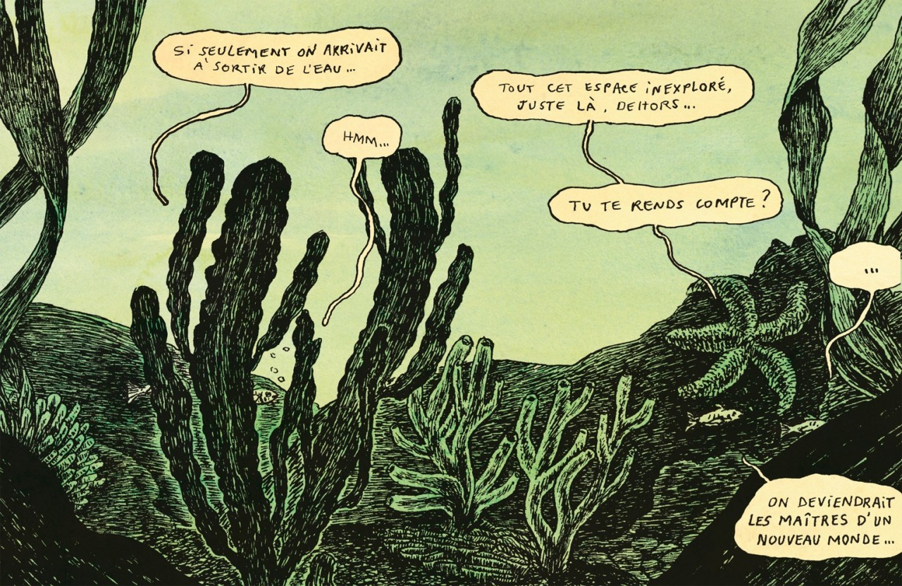L’évolution de la vie sur Terre a depuis longtemps été démystifiée, rationalisée et scrupuleusement mesurée par les scientifiques. Pourtant, certains originaux tentent encore de nous faire croire à d’étranges histoires. Antoine Fischer est assurément de ceux-là. Quoique plus inspirées du fait scientifique que du récit religieux, ses tribulations terriennes sont une réécriture de l’évolution des espèces, teintée d’humour, faite de détails étranges et d’images magnifiques