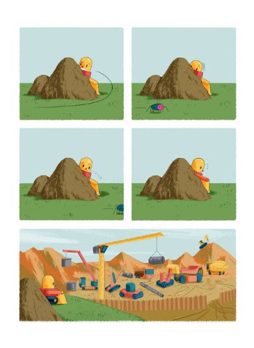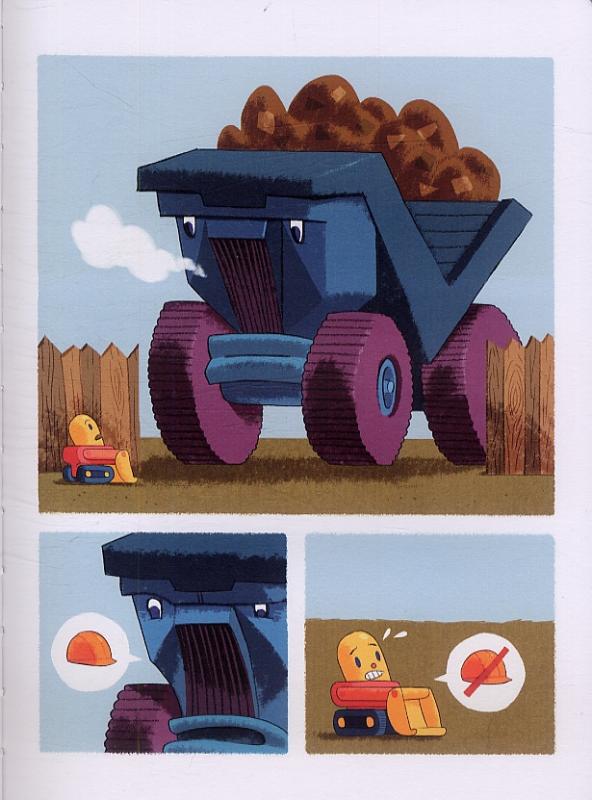 Trik Trak est un petit tractopelle curieux et avide d’aventure. Seul sur sa colline, il rêve d’aller sur le chantier de construction dans la vallée en contrebas. Muni d’un casque, il réussit à entrer sur le site et à devenir un travailleur de plus. Mais le contremaître est soupçonneux de par sa taille et garde un oeil sur lui. Accidentellement, toute l’équipe de construction se trouve ensevelie sous de gros rochers. Seul Trik trak est assez petit pour se faufiler et obtenir de l’aide. Il devient le héros de la journée et ami de tout le monde.