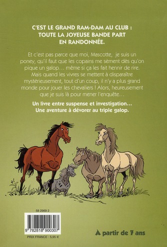 C’est le grand ramdam au club : toute la joyeuse bande part en randonnée. Et c’est pas parce que moi, Mascotte, je suis un poney, qu’il faut que les copains me sèment dès qu’on pique un galop. même si ça les fait hennir de rire. Mais quand les vivres se mettent à disparaître mystérieusement, tout d’un coup, il n’y a plus grand monde pour jouer les chevaliers ! Alors, heureusement que je suis là pour mener l’enquête.