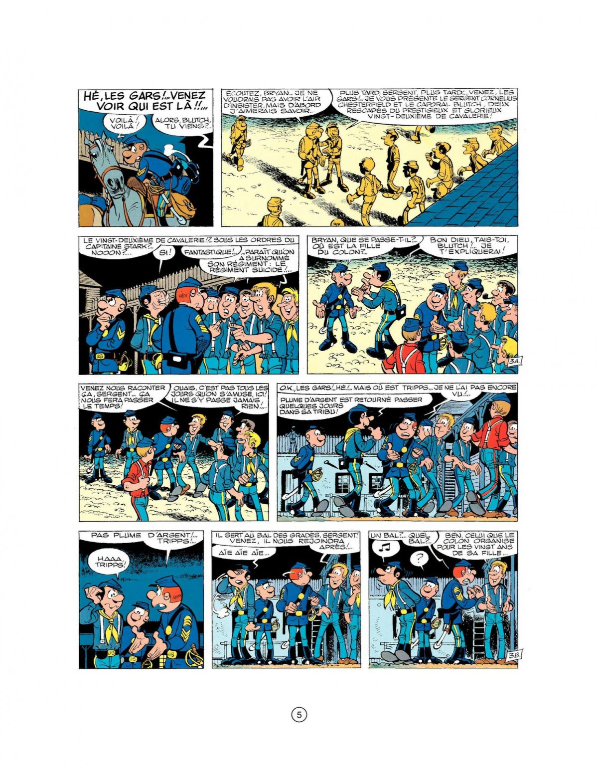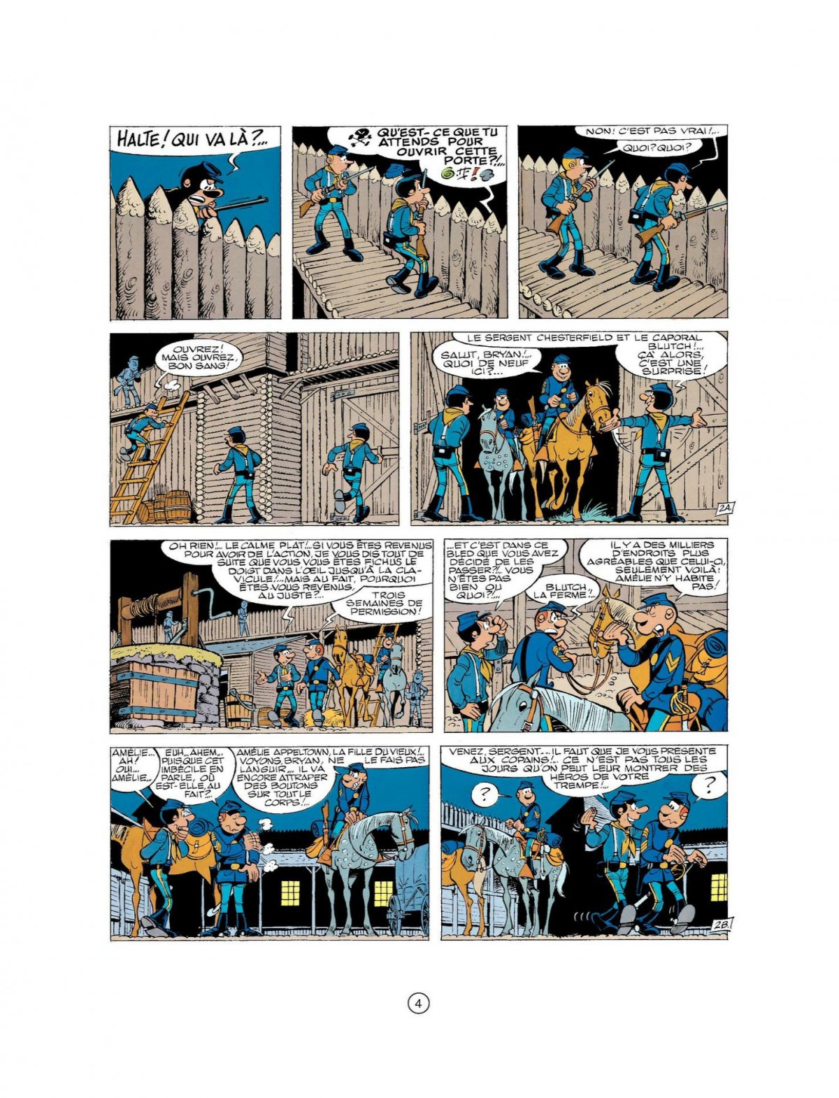 En permission à Fort Bow, le sergent Chesterfield et le caporal Blutch ne tardent pas à provoquer des ennuis. Dès leur arrivée au fort, ils apprennent en effet qu’Amélie Appeltown fête ses vingt ans en compagnie d’un beau lieutenant, ce qui déprime Chesterfield. Lui et Blutch se rendent alors à City-Bow, dans le saloon du coin, pour que Chesterfield noie sa tristesse dans l’alcool. La situation se complique quand Lune-d’Argent, le fils du chef indien Loup-Gris, est surpris à l’entrée du saloon. Racistes, les villageois du coin entendent bien malmener l’enfant en lui faisant boire de l’alcool. Blutch intervient alors mais se fait repousser. Il fait croire à Chesterfield que les agresseurs du petit indien ont insulté Amélie Appeltown, le sergent est alors déchaîné, ce qui donne lieu à une rixe et à l’intervention des soldats du fort, conduits par le jeune lieutenant qui dansait avec Amélie. La tension monte très vite entre le lieutenant et Chesterfield, qui se tapent dessus. Passablement énervé quand il reviendra au fort, le lieutenant commettra l’erreur de tirer sur le fils de Loup Gris, ce dernier cherchant à s’enfuir car Charlie, le patron du bar l’a emmené avec lui au fort. Le père du petit indien apprendra rapidement ce qui s’est passé, et exigera qu’on lui remette le coupable. Craignant que cet accident ne provoque une guerre, le Colonel hésite.
