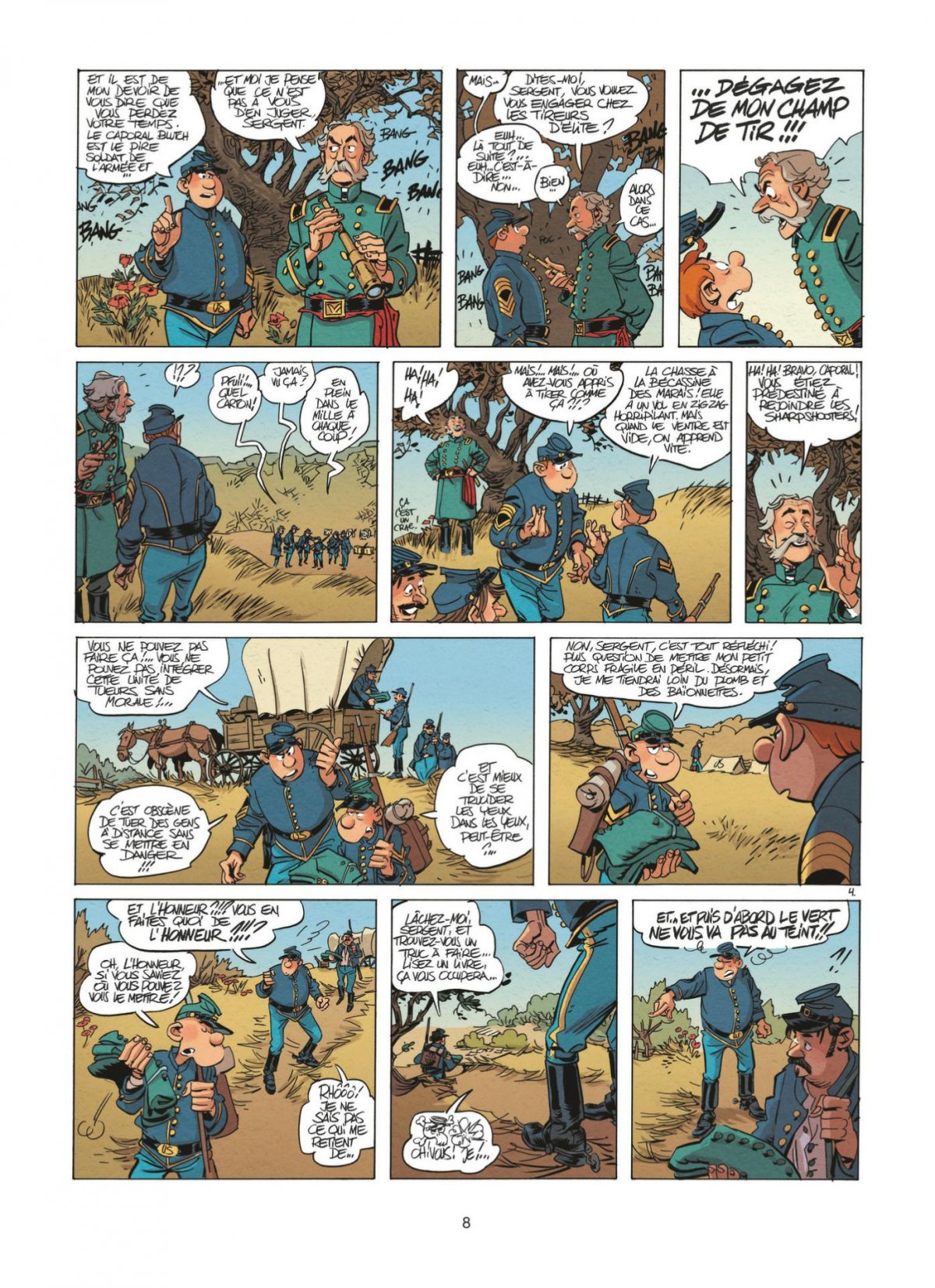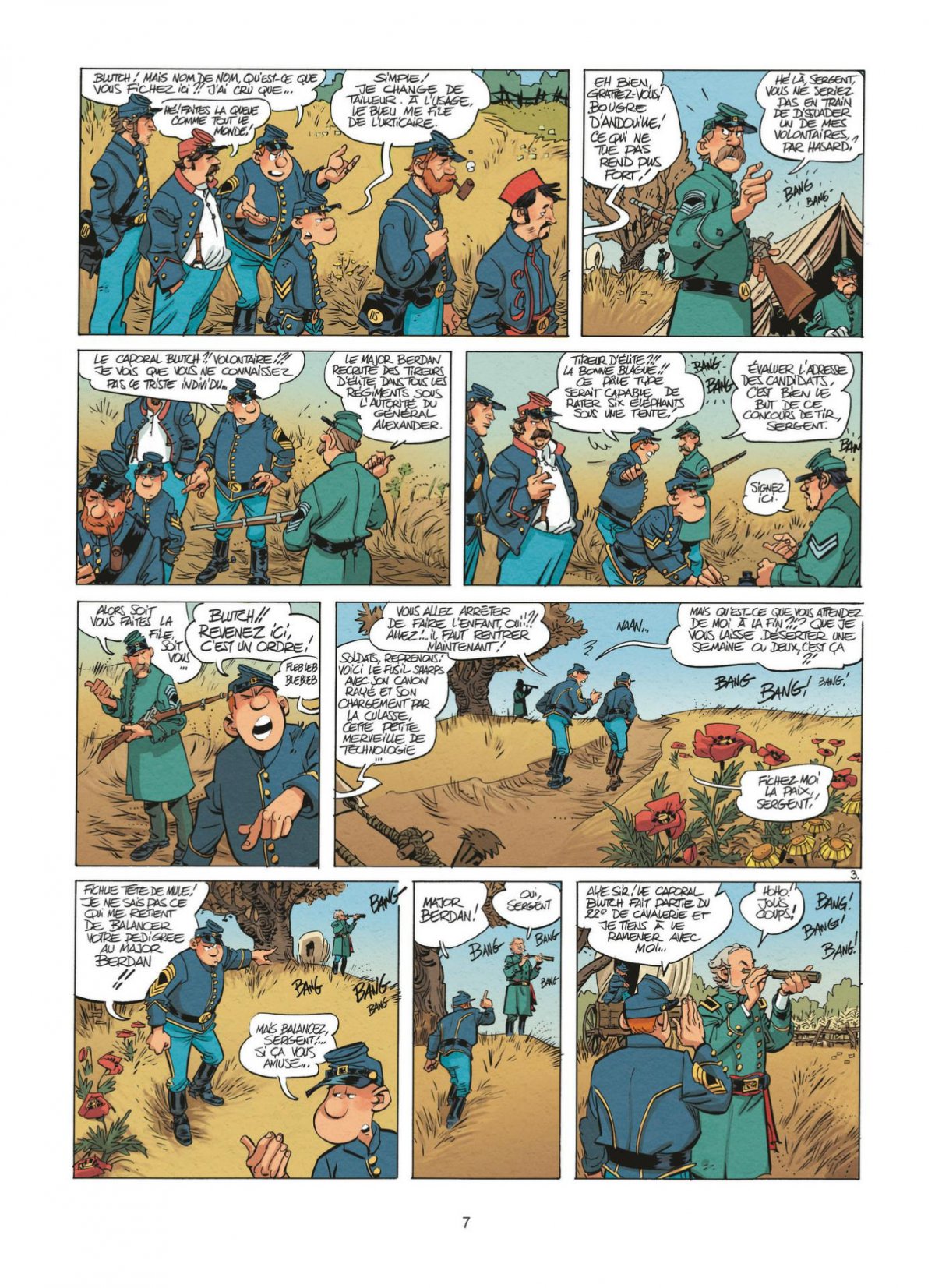 La couverture de cet étonnant album est par ailleurs signée par Blutch, dont le pseudonyme ne laisse aucun doute sur l’importance des Tuniques Bleues au sein même de sa carrière