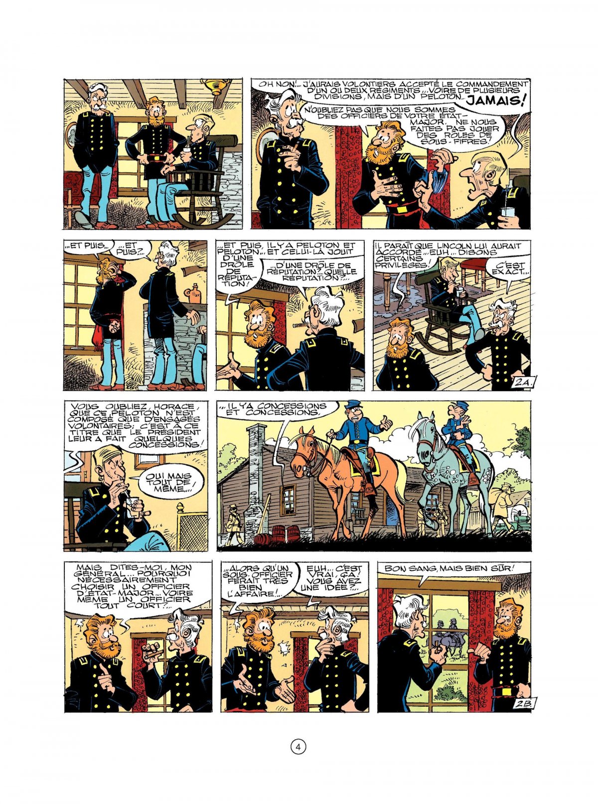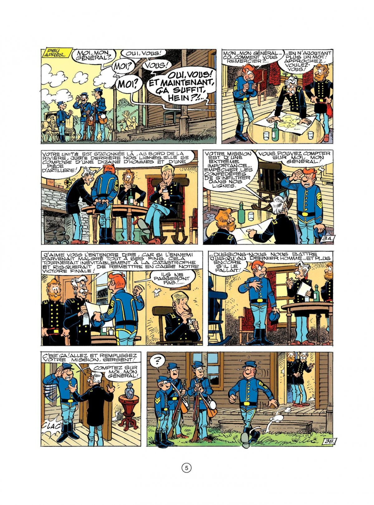 Après tant d’années de bons et loyaux services, le sergent Chesterfield prend du galon : le voici responsable d’un peloton chargé d’empêcher l’infiltration des confédérés. Mais, même si cette garnison est connue pour jouir de faveurs particulières du président Lincoln, rien ne prépare nos deux Tuniques Bleues à ce qu’elles vont découvrir : un campement (avec femmes et enfants) de soldats débraillés prêts à tout sauf à faire la guerre. Non loin, pourtant, l’ennemi s’est regroupé pour attaquer sans faire de quartier...