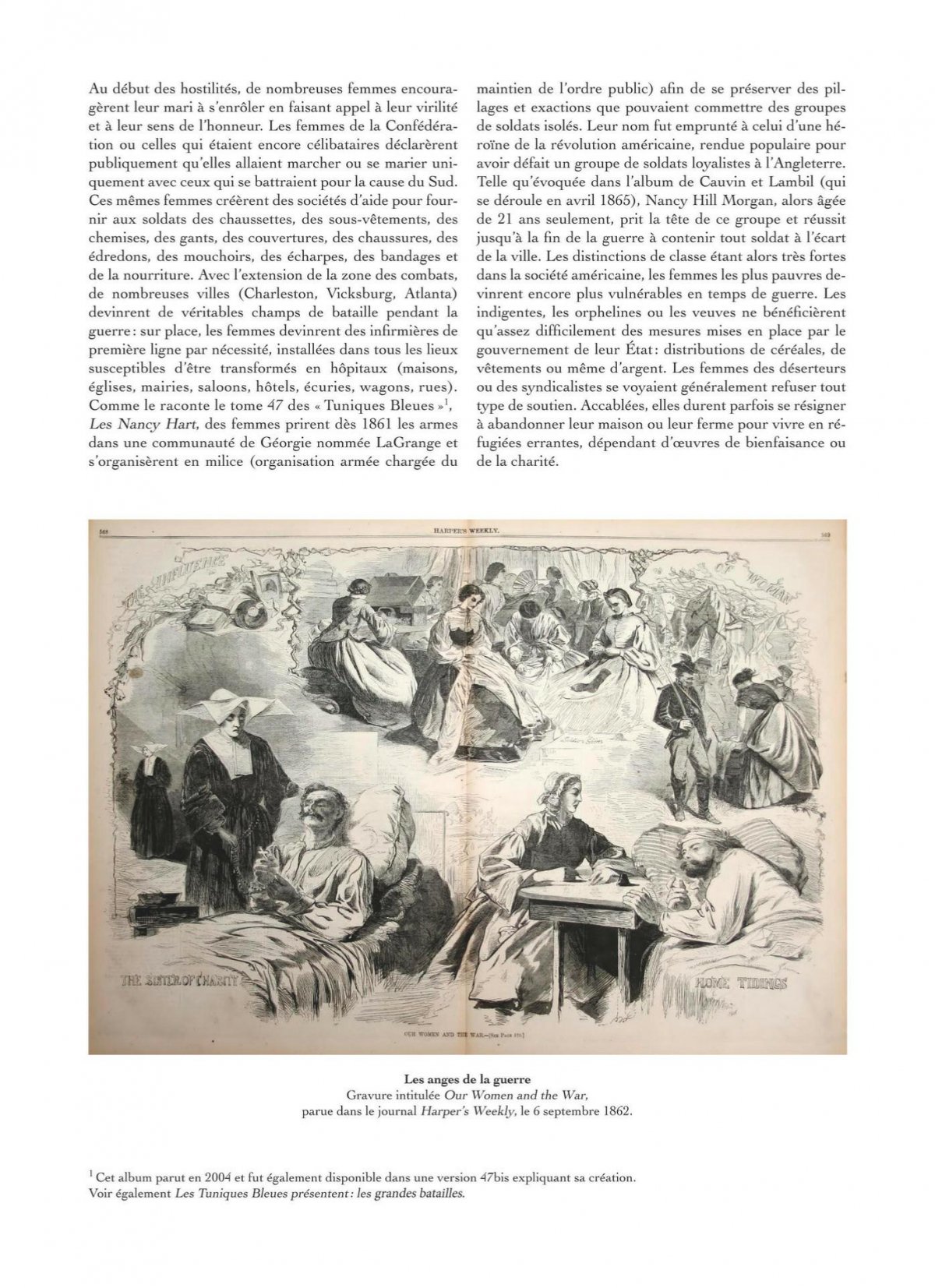 Ce neuvième tome se consacre à la place des femmes dans l’armée, depuis leur présence discrète jusqu’aux fonctions les plus essentielles. À travers deux albums, "Les Bleus dans la gadoue" (tome 13) et "Miss Walker" (tome 54), ce nouvel ouvrage s’intéresse au rôle subversif des espionnes, en la figure de Johan Cassidy de Bellevue, ainsi qu’à celui des infirmières et médecins, illustré par la caractérielle Miss Walker. Fort de ses recherches et de ses illustrations, le dossier de Philippe Tomblaine offre un portrait didactique de ces sujets féminins souvent sous-représentés en les replaçant dans le contexte historique qui fut le leur, au coeur de la guerre de Sécession. Un angle d’approche passionnant pour tous ceux qui ont déjà accompagné le sergent Chesterfield et le caporal Blutch dans leurs aventures !