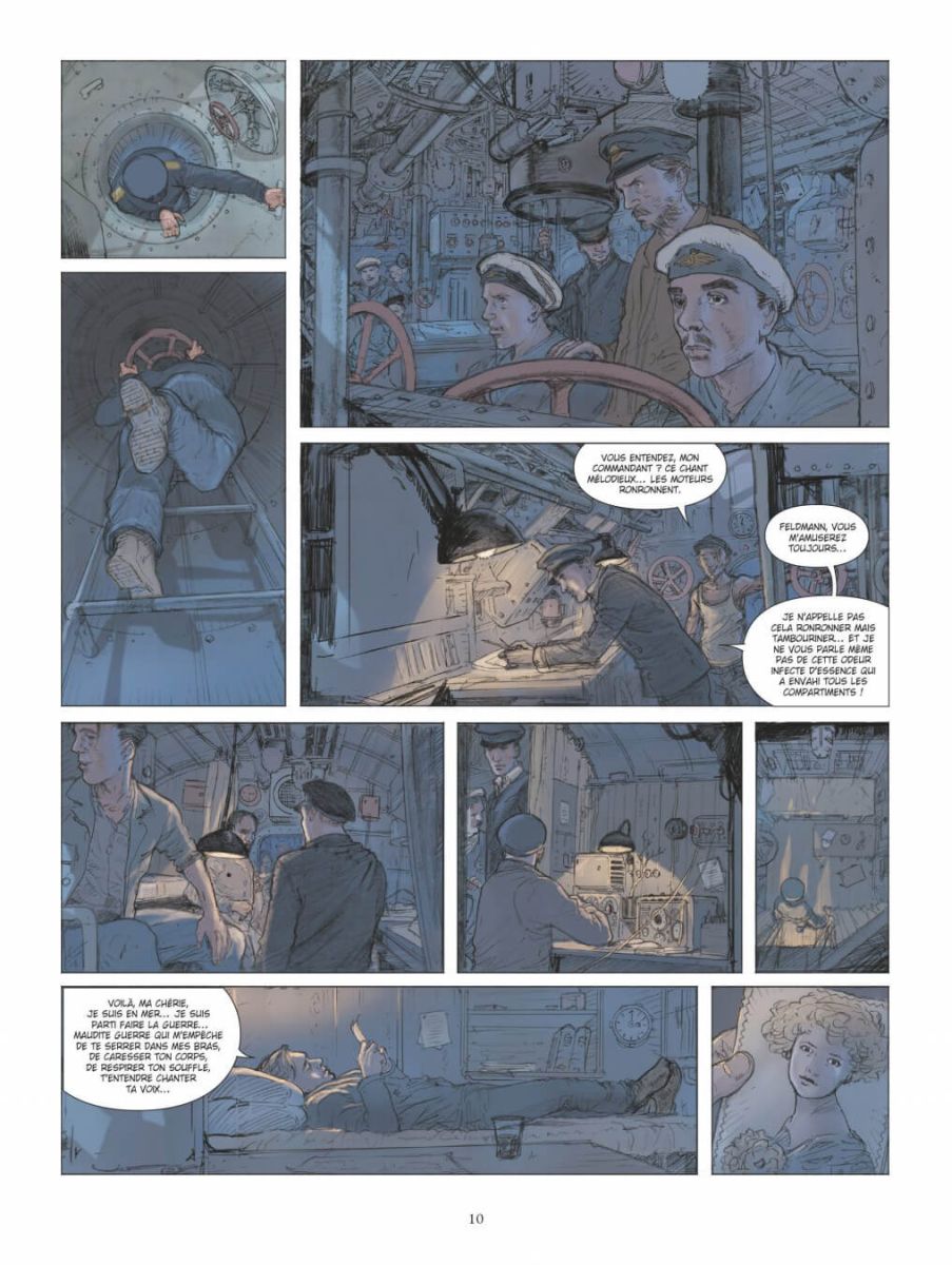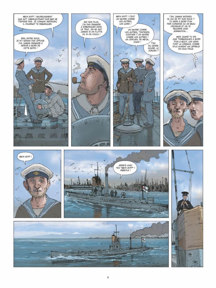 Septembre 1914. La Première Guerre mondiale a embrasé le monde dans un triste jeu de domino. Sur mer, la marine impériale allemande tente de s’opposer à la marine anglaise, première puissance mondiale incontestée sur toutes les mers et les océans. Dans cette guerre maritime qui voit s’affronter de titanesques cuirassés, croiseurs de bataille ou encore croiseurs cuirassés, une arme dénote quelque peu : le torpilleur submersible que l’on nomme plus généralement "sous-marin". L’arme n’est pas nouvelle, on en trouve la trace déjà dans des récits antiques, mais dans les premières heures du conflit mondial, le sous-marin - qu’il soit allemand, français ou anglais - demeure encore une machine imparfaite, malodorante, lente et faiblement armés. Que pourrait bien faire un submersible déplaçant quelques centaines de tonne contre un vaisseau de surface armé de puissants canons et dont le tonnage se compte en dizaine de milliers de tonnes ? Aux premières lueurs du 22 septembre 1914, l’improbable va ébranler les certitudes. Dans les eaux grises de la mer du Nord, le SM U9 de la Kaiserliche Marine allemande avec 26 hommes d’équipage et commandé par Otto Eduard Wediggen va envoyer par le fond trois croiseurs cuirassés anglais en moins d’une heure, infligeant à la Royal Navy l’un des plus sévères camouflets de la guerre. Pour son dernier album, Philippe Adamov (Les Eaux de Mortelune et L’Impératrice rouge) revient sur un exploit historique en compagnie de Jean-Yves Delitte.