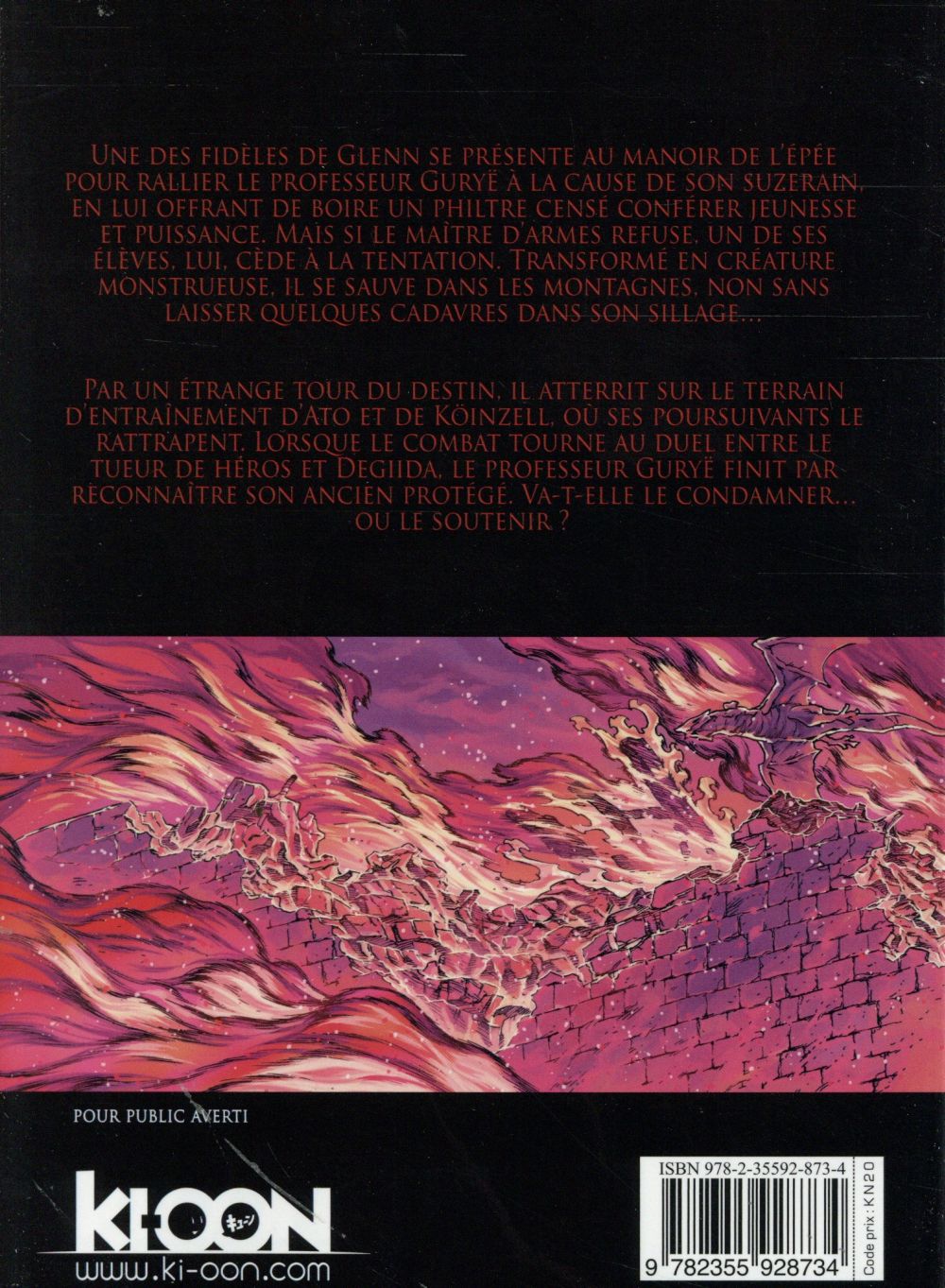 Une des fidèles de Glenn se présente au manoir de l’épée pour rallier le professeur Guryë à la cause de son suzerain, en lui offrant de boire un philtre censé conférer jeunesse et puissance. Mais si le maître d’armes refuse, un de ses élèves, lui, cède à la tentation. Transformé en créature monstrueuse, il se sauve dans les montagnes, non sans laisser quelques cadavres dans son sillage..