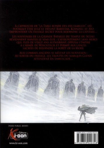 A l’approche de la Table Ronde des Dix Familles où pourrait être jugé le défunt Barestar, Koinzell et Ato empruntent un passage secret pour rejoindre la capitale. Les souvenirs de la grande bataille du temple du sceau reviennent hanter le semi-elfe : l’affrontement sans merci qui, plus de vingt ans auparavant, opposa l’empire à l’armée de Wischtech et permit aux lances sacrées de rejoindre la forêt de la mort. Aux combats anciens se mêlent les nouveaux : au sortir du passage, les troupes du marquis Glenn attendent en embuscade.