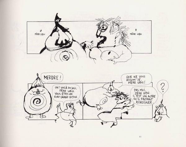 Ubu roi, d’Alfred Jarry, a été publié et joué pour la première fois à Paris en 1896. L’artiste d’origine polonaise Franciska Themerson (1907-1988) l’a adapté en bandes dessinées en 1970. Son sens du grotesque, sa verve graphique et la sauvagerie de son trait servent ce chef-d’oeuvre qu’est Ubu.