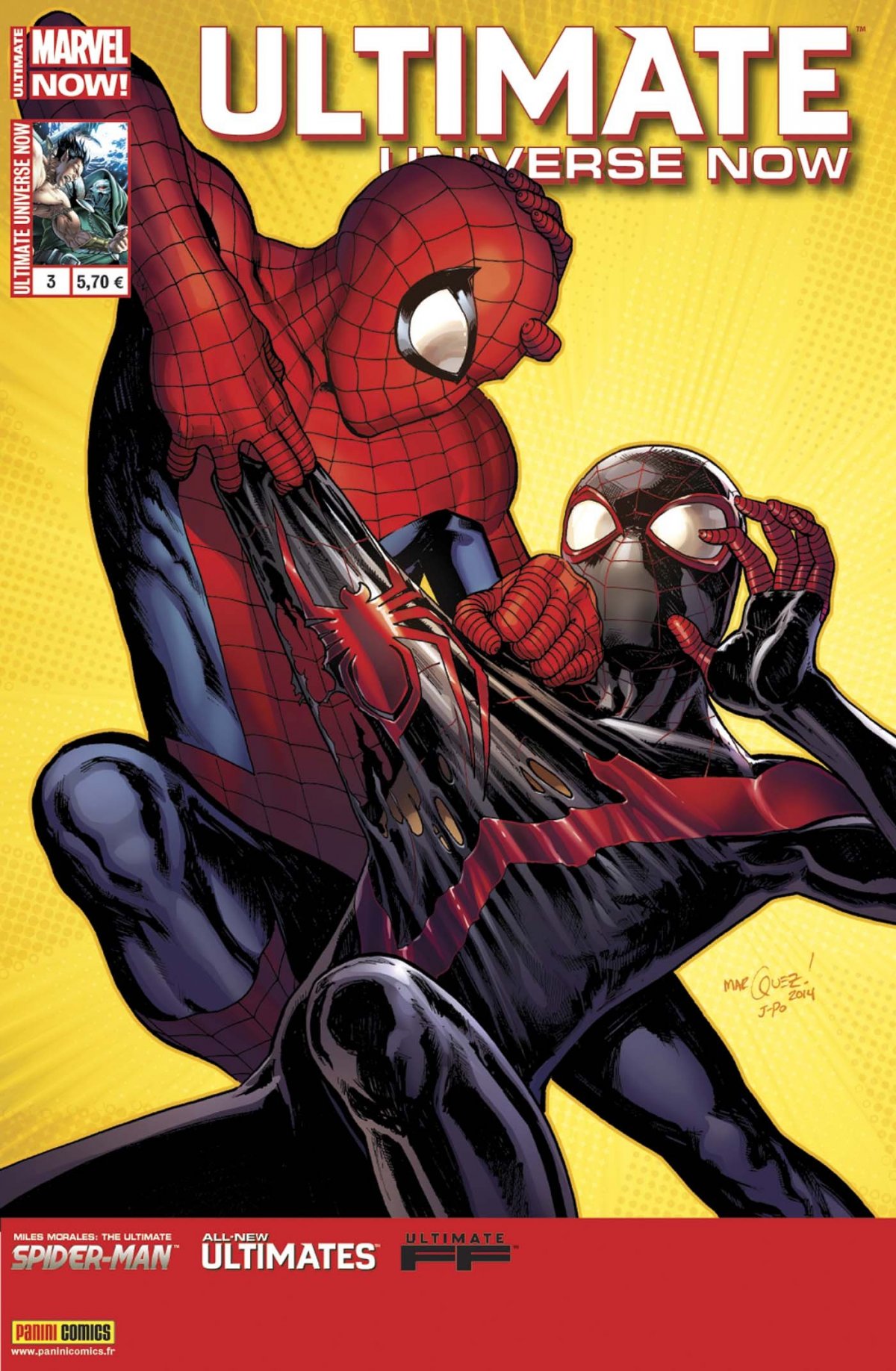 Entrez dans le monde des nouveaux Ultimates et des nouveaux Quatre Fantastiques. Assistez au nouveau départ de Miles Morales/Spider-Man et au retour inattendu d’une vieille connaissance ! Par Bendis, Bagley, Quinones, Marquez, Fialkov, Fiffe, Pinna, Guevara et Grummett