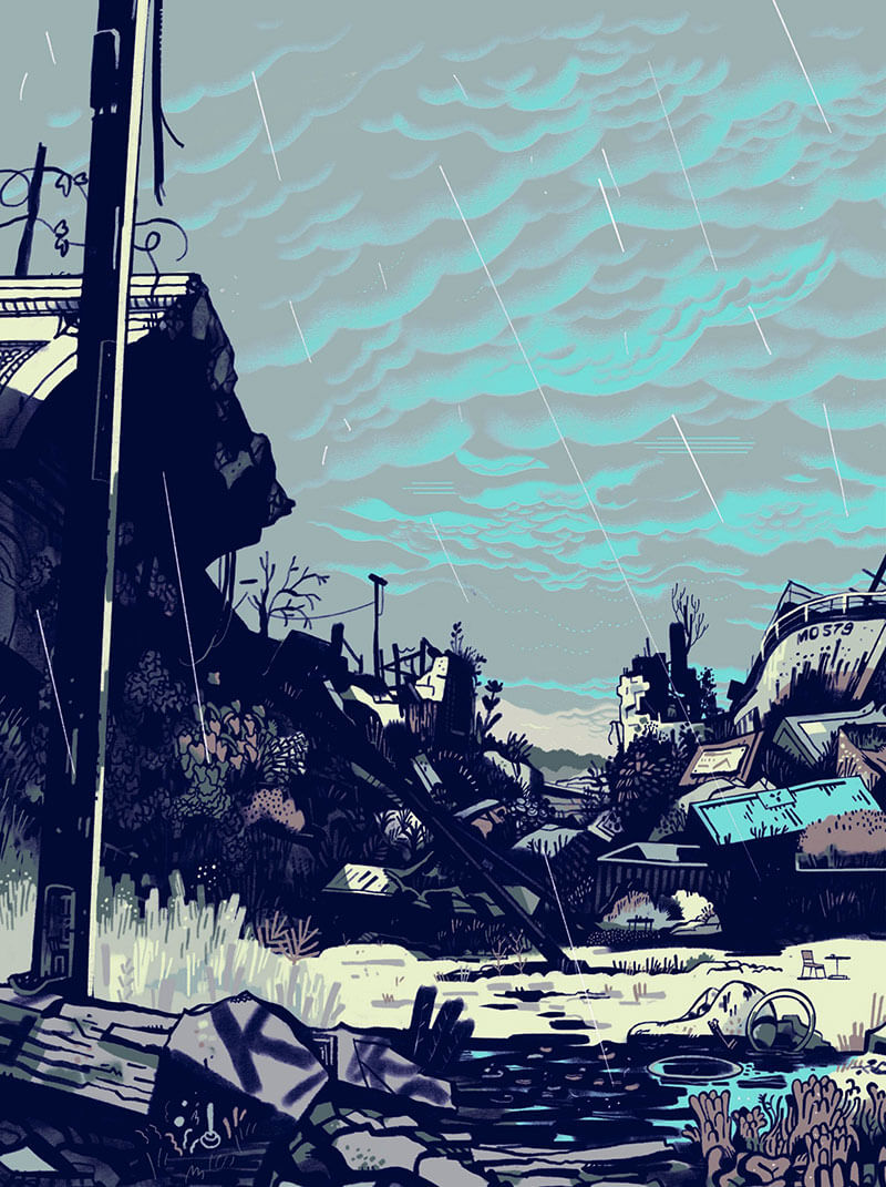 Pourtant, cette centrale n’est plus que ruines. Les toitures sont effondrées, le béton des réacteurs est fissuré depuis longtemps, le vigile que le gardien s’efforce de saluer n’est qu’un hologramme qui, sans explication, reçoit toujours l’électricité nécessaire à son activation... Dans cette grande cathédrale, bâtiment mythique de la puissance de la Techno-science, les procédures du Gardien se muent en rituels, le silence et les ombres se chargent peu à peu de donner une âme aux lieux, et notre Robinson esseulé, dans son délire, fait de ce sanctuaire nucléaire un temple accueillant les esprits des aïeux
