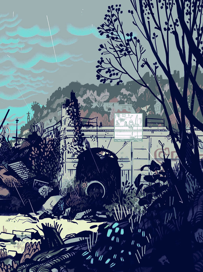 Imaginée en contrepoint à Soon (scénario Thomas Cadène, paru chez Dargaud en 2019), UOS est une exploration graphique de l’univers de l’Effondrement, une ballade sensorielle au pays du retour en grâce, parmi les ruines, d’un être humain à l’écoute des Esprits et de la Nature.