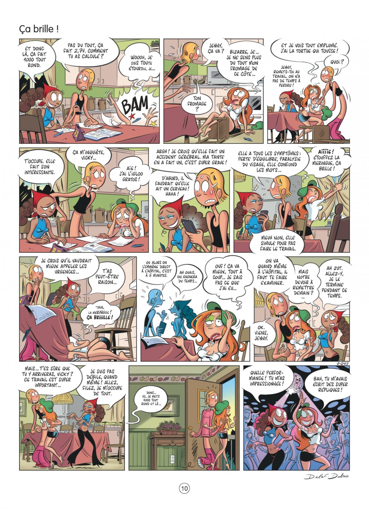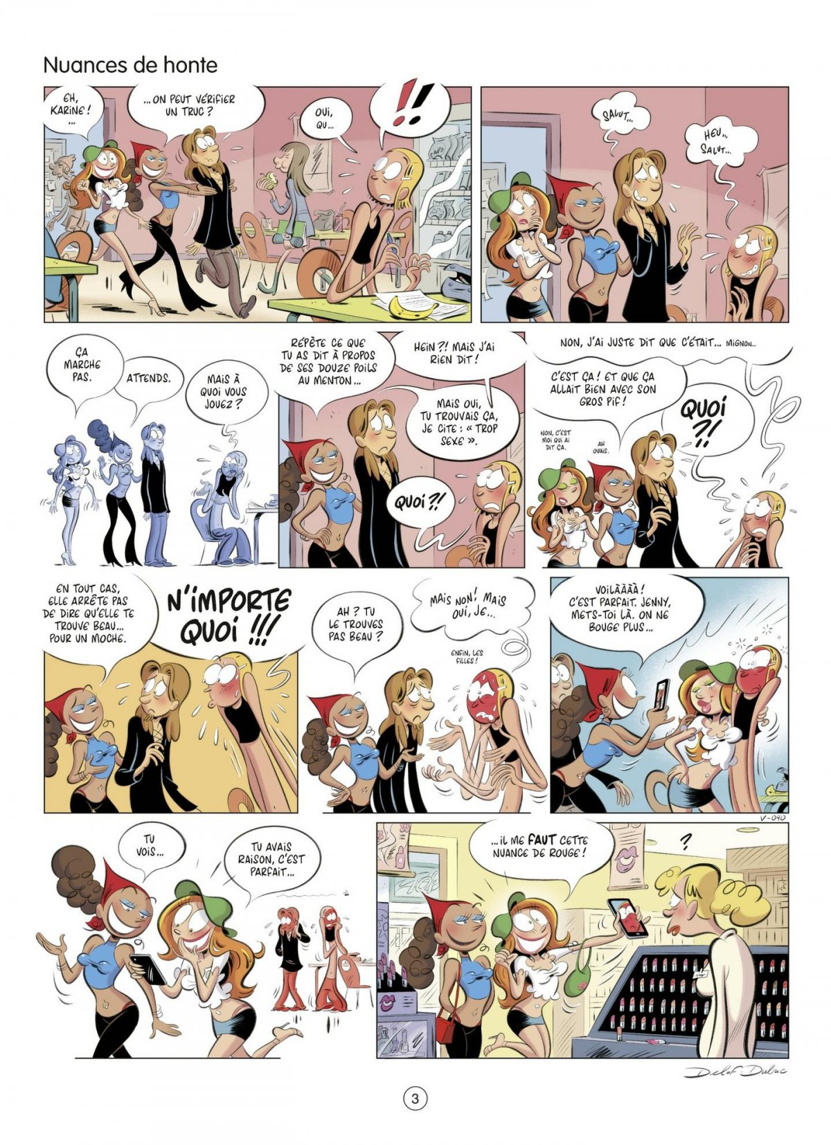 Dans cette série dérivée des Nombrils, on retrouve Karine, Jenny et Vicky au temps où Karine ne sortait pas encore avec Dan et où elle faisait, sans broncher, les devoirs de ses deux "amies". Mais on découvre aussi l’origine de l’amitié entre Vicky et Jenny quand une Vicky boulotte et boutonneuse bavait devant une Jenny ultra sexy et fraîchement débarquée dans l’école. Et comment Vicky n’a pas hésité à lâcher sa seule amie de l’époque pour traîner aux côtés de Jenny, appelée à devenir inévitablement la fille la plus populaire du bahut. On découvre aussi l’intelligence de Vicky qui multiplie les trucs tordus pour faire faire ses devoirs à Karine (comme demander à Jenny de simuler une attaque cérébrale) ou pour faire virer les mecs qui ne s’intéressent pas à elle avec assez d’enthousiasme. Un album 100 % "gag"qui se situe chronologiquement au moment du tome 1 de la série principale. Tout simplement hilarant !