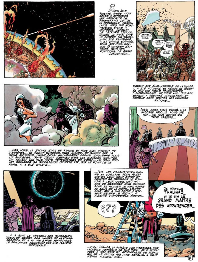 Celui-ci atterrit sur Thauma, la planete des prodiges et de tous les délires ou plus rien ne se rattache a la logique ni a la réalité. La-bas, le Vagabond va se heurter aux illusions mortelles de la vie. Et si l’existence n’était rien d’autre qu’une succession d’apparences ? trompeuses, forcément trompeuses ? Toujours en compagnie de Muskie, Axle Munshine ? alias le Grand Conciliateur - poursuit son exploration du Cosmos depuis la capitale de la Guilde
