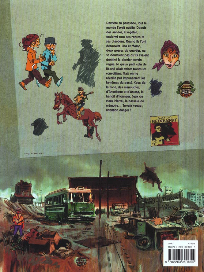Derrière sa palissade, tout le monde l’avait oublié. Depuis des années, il végétait, endormi sous ses ronces et ses chardons. Quand ils l’ont découvert, Lisa et Momo, deux gosses du quartier, ne se doutaient pas qu’ils avaient déniché le dernier terrain vague. Ni qu’un petit coin de liberté allait attiser toutes les convoitises. Mais on ne réveille pas impunément les fantômes du passé. Ceux de la zone, des manouches, d’Angélique et d’Ascaso, le bandit d’honneur. Ceux du vieux Marcel, le passeur de mémoire... Terrain vague : attention danger !