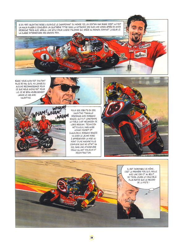 Cette année et à 41 ans Valentino Rossi va mettre un terme à sa carrière, il était temps de revenir en détails sur son exceptionnelle trajectoire ! … Et quoi de mieux que la BD pour raconter cette histoire hors du commun. C’est en 1996 que Valentino fait ses premiers pas dans le monde des GP. Rapidement il montre une virtuosité hors norme et dès 1997 il est sacré champion du Monde en catégorie 125. La victoire ne le lâchera plus ! Il sera 9 fois champion du Monde !