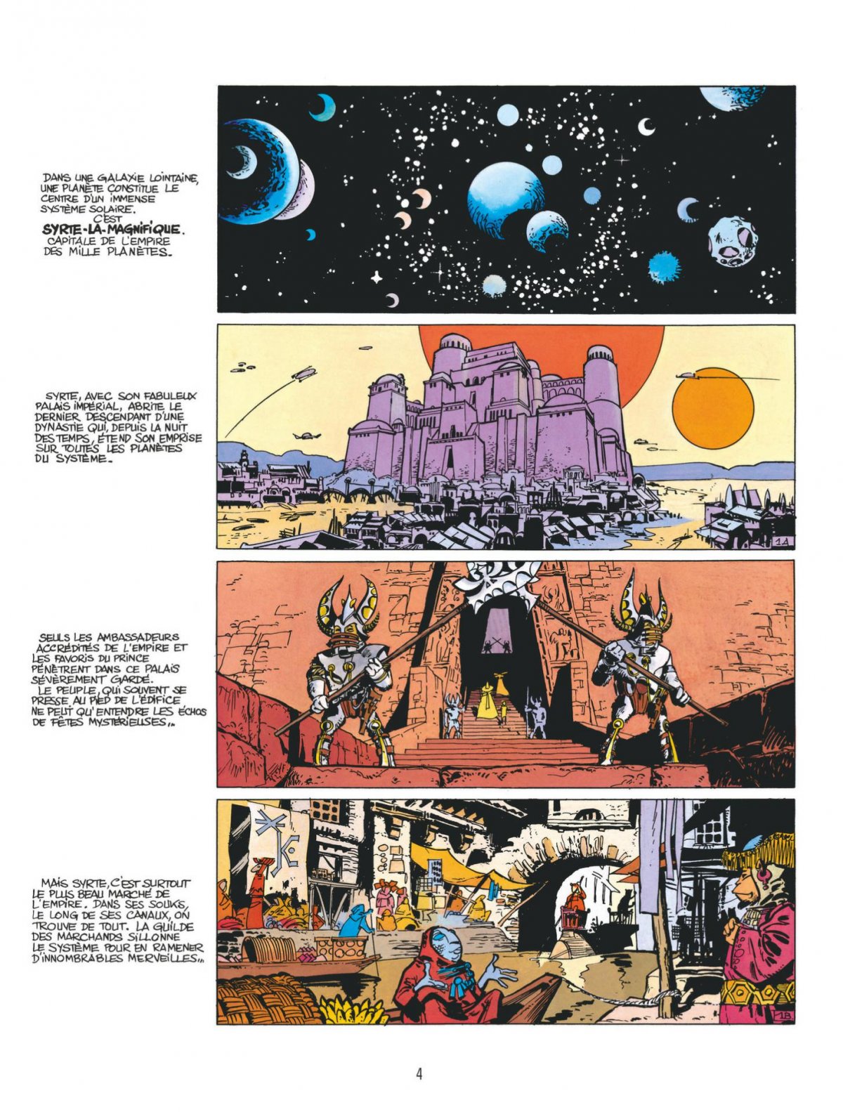 Sur Syrte-la-Magnifique, capitale de l’Empire des mille Planètes, les luttes de pouvoir inquiètent la Guilde des marchands... L’imagination débordante de Christin est relayée par le foisonnement graphique de Mézières : aux créatures fantastiques du premier répondent les décors merveilleux du second. Le premier grand classique de la saga.