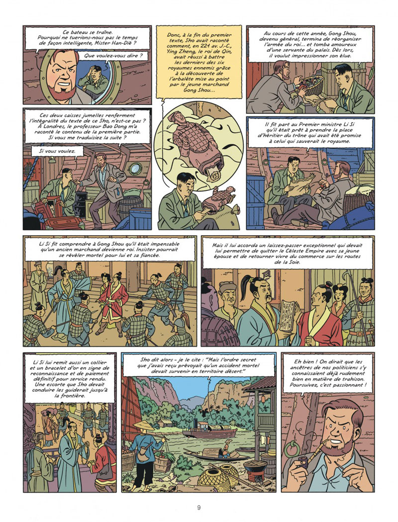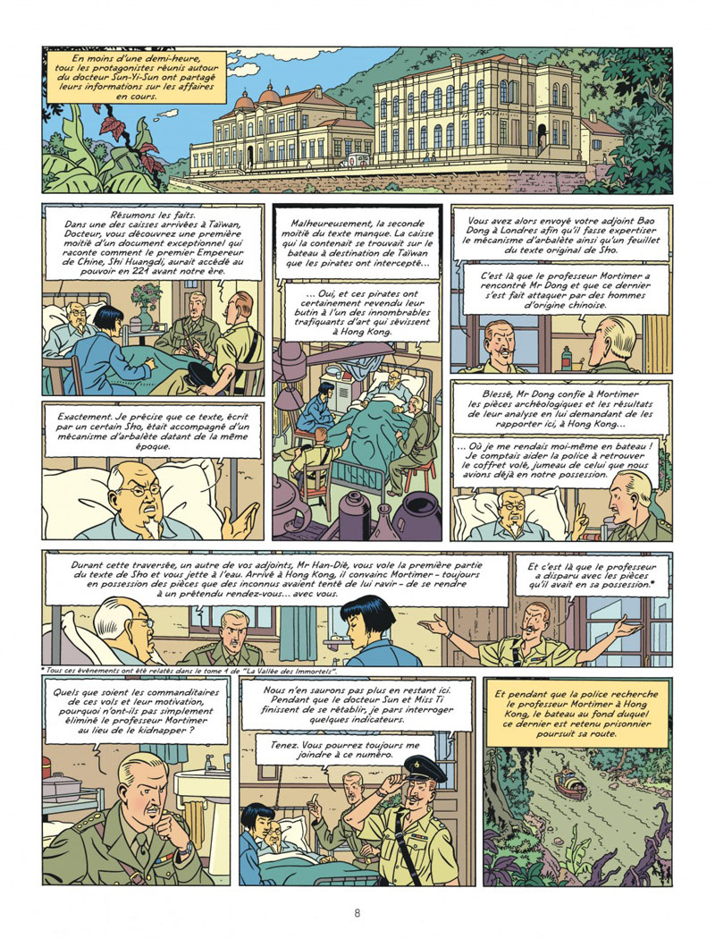 Inquiets pour Mortimer qui a été kidnappé par les hommes du général Xi-Li, le capitaine Blake, accompagné de l’agente nationaliste chinoise Ylang Ti, se lance à la recherche de son ami. Se servant des indices que Mortimer a eu l’intelligence de semer sur son chemin, ils remontent peu à peu la piste qui devrait les conduire jusqu’à lui. De leur côté, Mortimer et Han-Dié, archéologue nationaliste qui a trahi son gouvernement pour vendre des documents historiques au général Xi-Li, sont emmenés de force vers le repaire du seigneur de guerre. Mortimer profite de ce voyage pour en apprendre davantage sur les documents qui apporteront la preuve à Xi-Li qu’il est bel et bien le descendant et l’héritier de Shi-Huangdi, le premier empereur de Chine... . dont la légende dit qu’il aurait été emmené à la fin de sa vie dans la Vallée des Immortels. Arrivé au camp de prisonniers, Mortimer retrouve Nasir, prisonnier de Xi-Li et à l’agonie. Déterminé à sauver son ami grâce à une " perle de vie " miraculeuse, Mortimer s’évade en compagnie de Mister Chou à la recherche de la fameuse Vallée des Immortels où ces perles seraient cachées. Et si ce mystérieux endroit n’était pas qu’un mythe ? Blake parvindra-t-il à rejoindre Mortimer à temps ? Nos deux héros pourront-ils sauver Nasir ? Surtout, parviendront-ils à sauver Hong Kong à temps des projets de destruction ourdis par le général Xi-LI et l’étrange ingénieur Chase... alias, le colonel Olrik ?