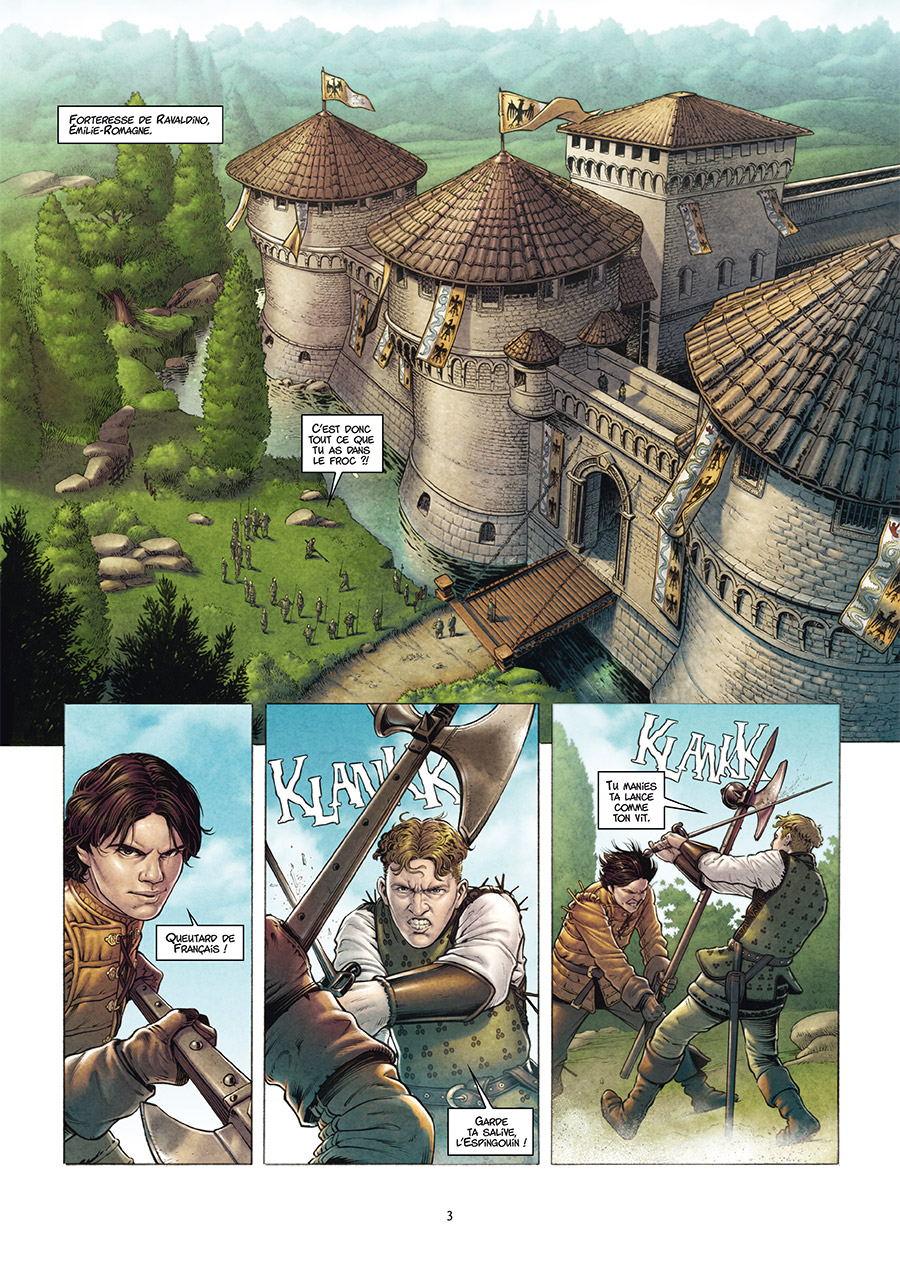 Sur les remparts d’une forteresse, Henri Guivre de Tersac et Blasco de Vilallonga se battent en duel. Blasco finit par avoir le dessus et se joue de son acolyte. Ce combat est un avant-goût de ceux à venir : le lendemain, la légèreté disparaîtra et leur armée, pion sur l’échiquier italien, se mettra en mouvement. Échiquier sur lequel est déjà posé un roi : Charles VIII.