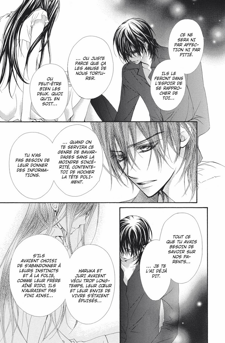 Kaname, le chef charismatique des vampires, ou Zero, le leader des Hunters. L’heure des grandes décisions a sonné. Yûki, la princesse vampire, ne peut plus reculer. Elle doit choisir son camp. Les doutes l’assaillent, surtout qu’elle est consciente que Kaname cherche à dissimuler un lourd secret. Que s’est-il passé plusieurs siècles auparavant, au cours de la grande guerre qui vit les sang pur s’entredévorer ? Nous brûlons de le découvrir !