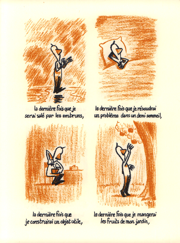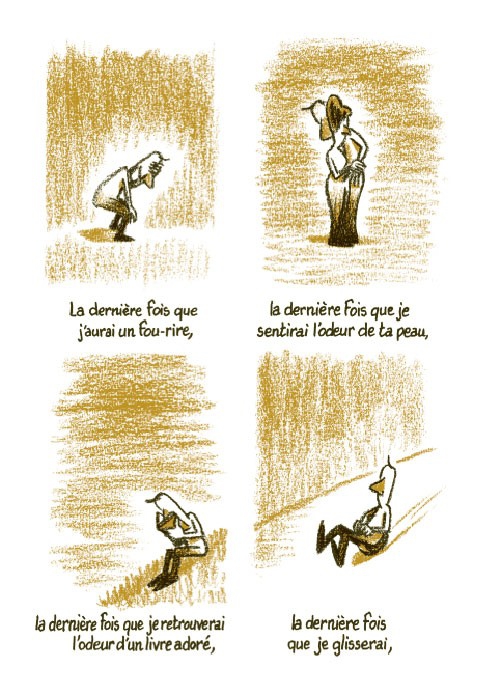 Il y évoque un à un les moments où il fera, verra, éprouvera une dernière fois les choses, grandioses ou banales, qu’il regrettera lorsqu’il ne sera plus. On retrouve notre imperturbable Oubapien qui construit au fil des pages l’inéluctable final qui justifie son titre