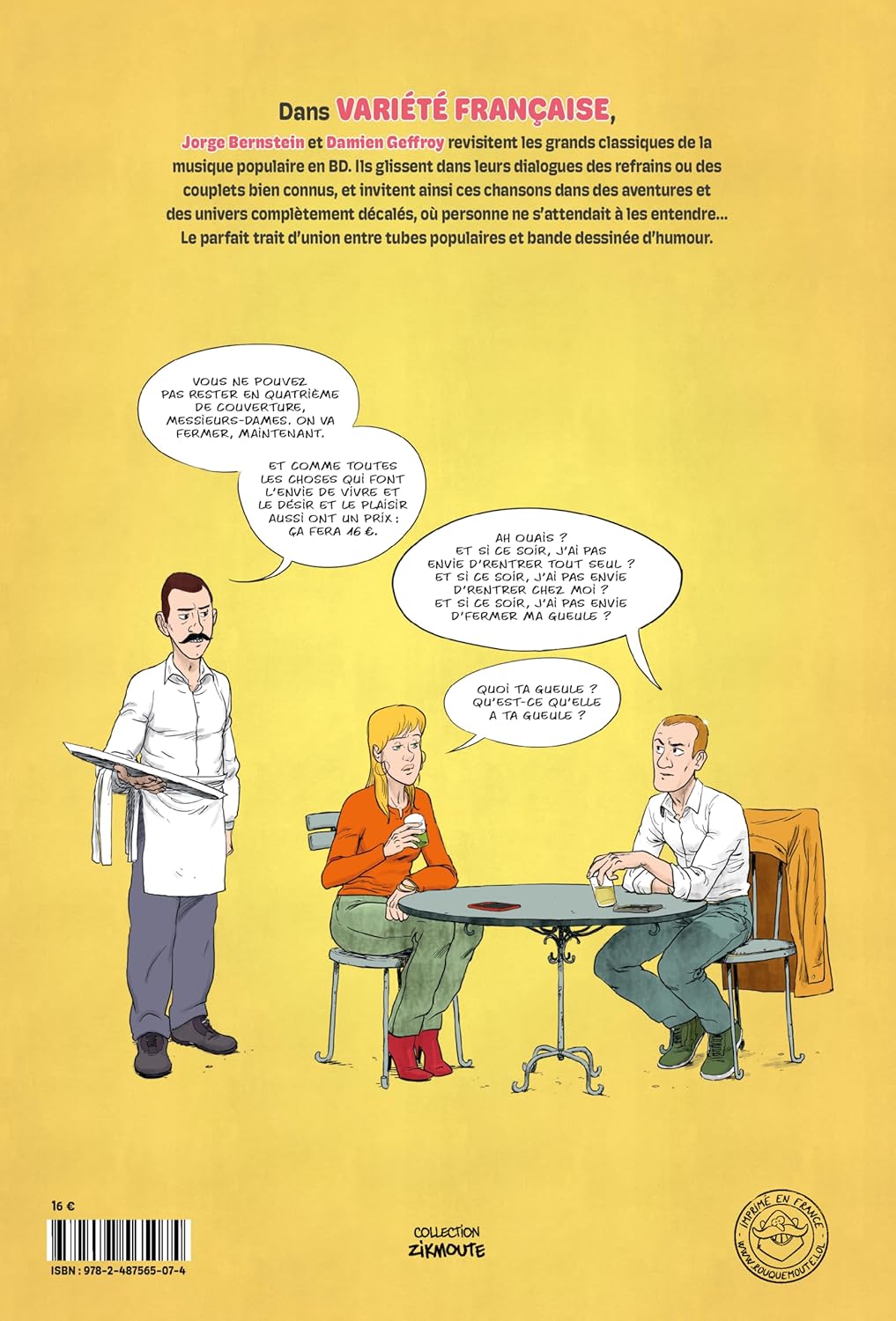 Dans Variété française, Jorge Bernstein et Damien Geffroy revisitent les grands classiques de la musique populaire en BD. Ils glissent dans leurs dialogues des refrains ou des couplets bien connus, et invitent ainsi ces chansons dans des aventures et des univers complètement décalés, où personne ne s’attendait à les entendre…