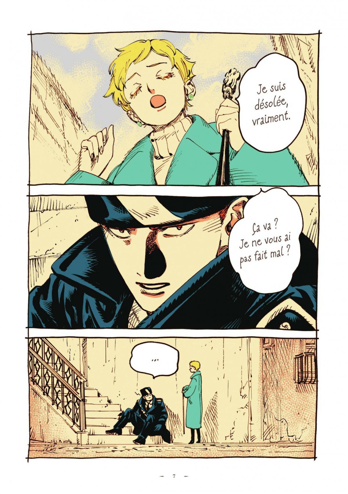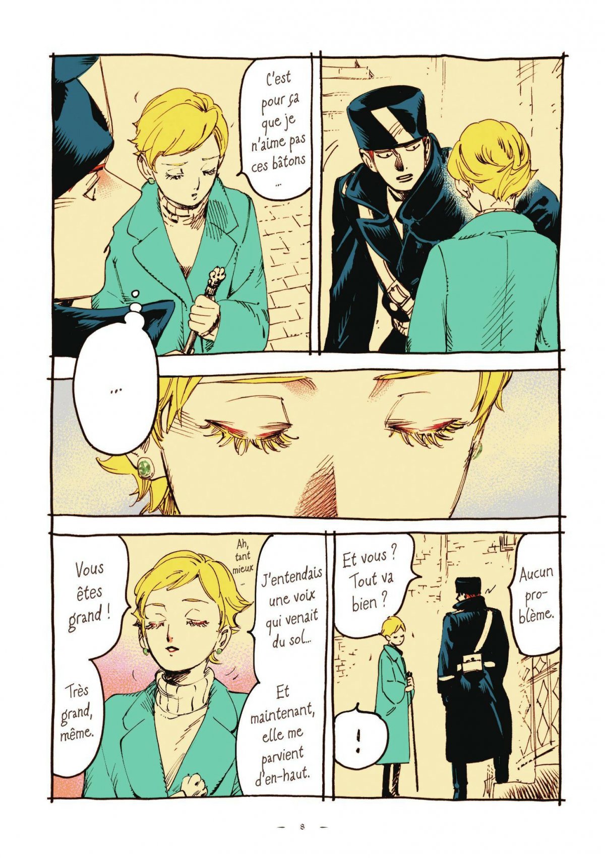 Veil est plus un rêve que vous avez fait qu’une histoire que vous lisez, et elle persiste de la même manière, des détails flous mais des émotions qui flottent définitivement dans votre coeur. Ce premier volume, entièrement en couleur, est construit comme une représentation de petits moments de vie entre les deux protagonistes, interrompus par de sublimes illustrations offrant comme un sentiment de rêverie. L’homme est un officier de police, la femme est aveugle ou du moins n’ouvre jamais les yeux. Les noms, les lieux, l’époque n’ont pas d’importance, car notre plaisir consiste à simplement les regarder se rapprocher l’un de l’autre à travers les chapitres.