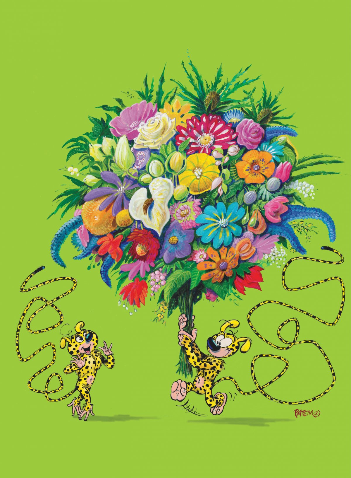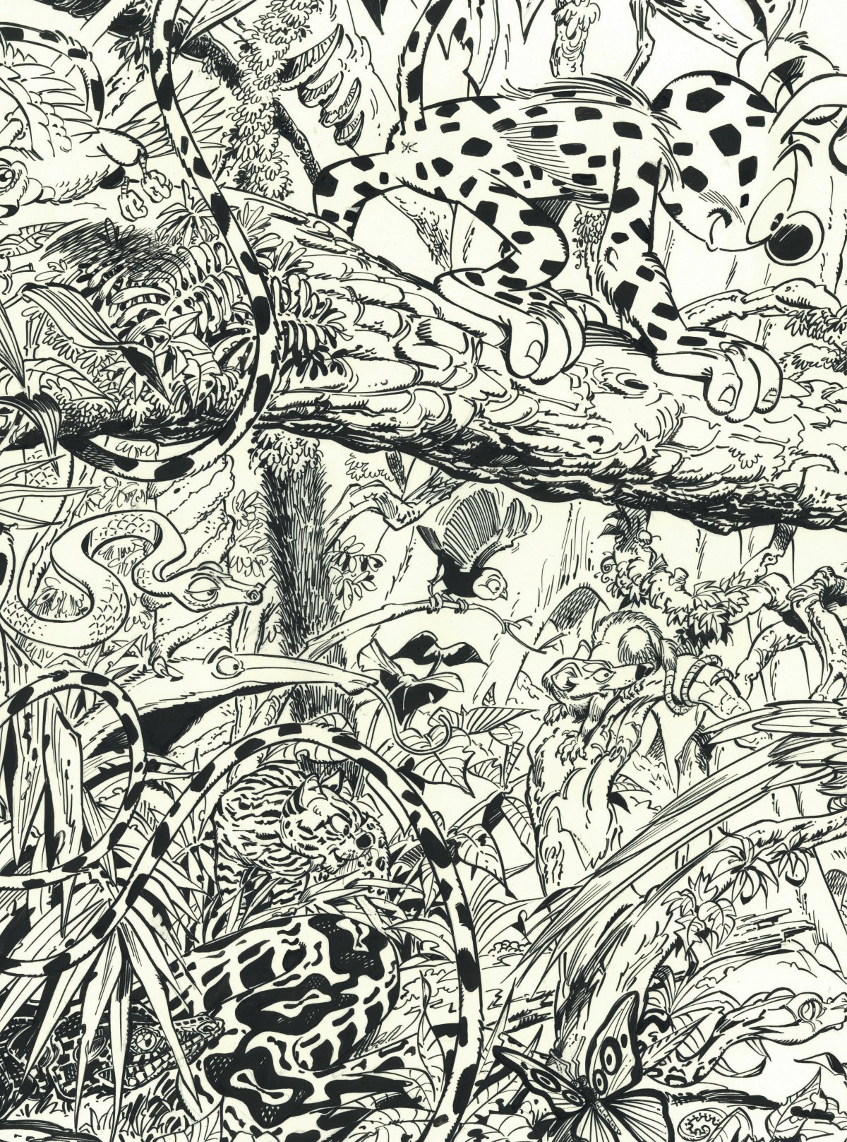 Batem a donc bénéficié d’une véritable leçon de dessin et de narration offerte par un géant de la BD. Franquin avait deviné que Batem deviendrait un des plus grands dessinateurs animaliers, tendance dessin humoristique. Lors de la réalisation des albums, Batem a eu la chance de travailler avec des pointures du scénario : Greg, Yann, etc. Autant d’enrichissements pour l’univers du Marsupilami ! Redoutable illustrateur, il a mis en scène l’univers de la diva palombienne dans de superbes illustrations en noir et blanc et en couleurs. Via une reproduction en fac-similés, « Une vie en Dessins » – Marsupilami de Batem présente la quintessence de son travail !