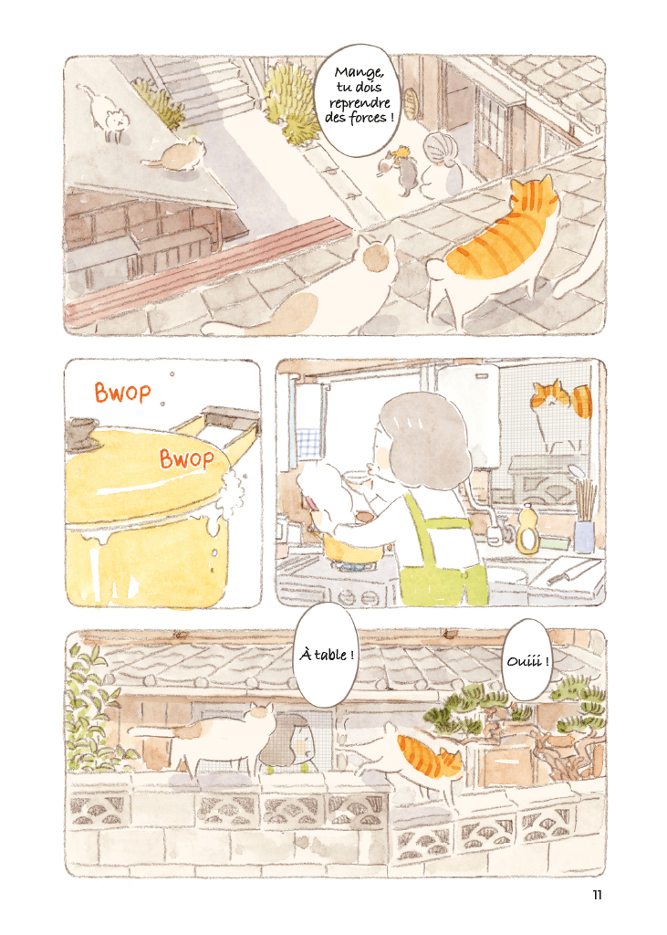 Une nouvelle année commence sur l’île aux chats, et avec elle son lot d’activités qui ne manquent pas réveiller des souvenirs. Il sera beaucoup question ici de bentos. Mais si, ces repas qu’on prépare chez soi et qu’on transporte dans une boîte lorsqu’on mange à l’extérieur ! Daikichi repense à celui que Mémé lui avait concocté en prévision d’une partie de pêche nocturne ; il se remémore avec tendresse ceux de sa mère lorsque, étudiant, il avait des examens... Remontant toujours plus loin le fil de sa mémoire, il revoit même ces boîtes à bento en aluminium réquisitionnées pendant la guerre. Tous ces souvenirs ont ceci en commun : l’amour que l’on met dans ce que l’on cuisine pour les personnes qui nous sont chères.