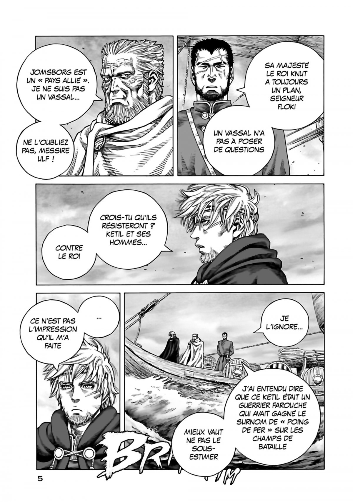 Thorfinn a tourné le dos à sa vie de mercenaire et aspire aujourd’hui à une vie de non-violence. mais après la fuite avortée de Gardar et Arneis, qui s’est soldée par la mort de plusieurs des hommes du Serpent ainsi que de gardar lui-même. Arneis , Throfinn et Einar sont ligotés et enfermés dans la grange pour attendre leur châtiment. Quelques jours plus tard, Maître ketil revient clandestinement à la ferme au bord du bateau de leif, après que le roi, bien décidé à le déposséder de ses richesses