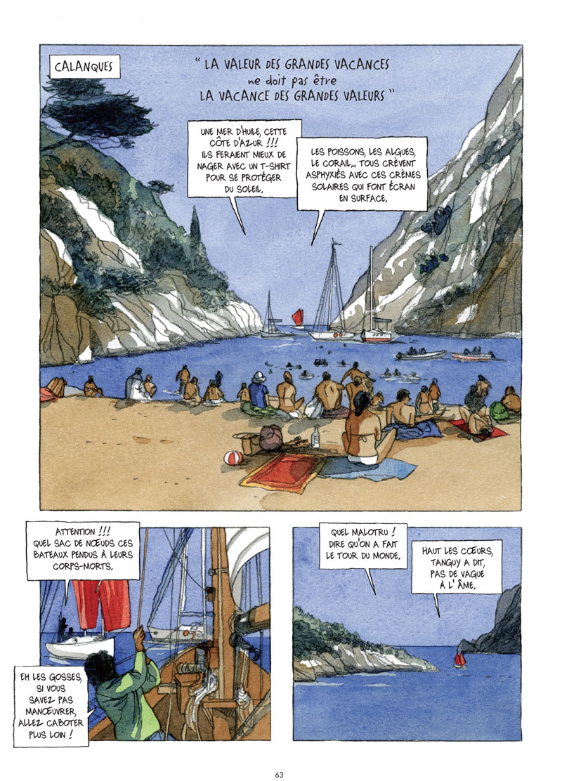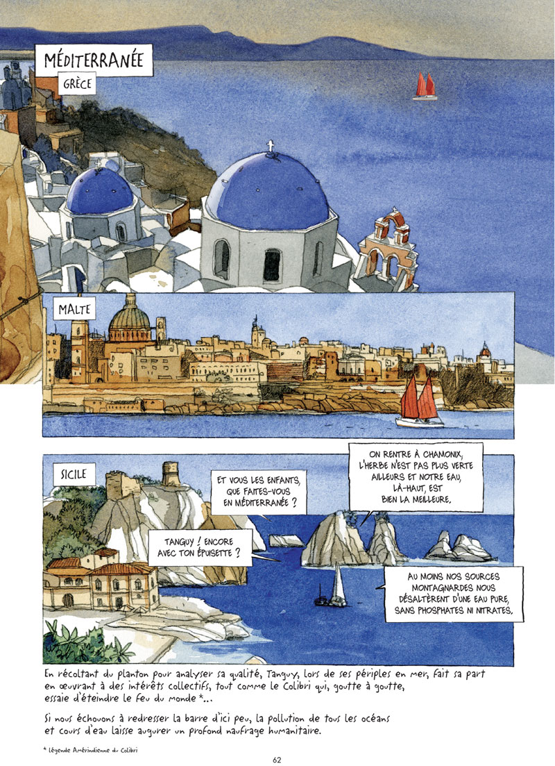 Depuis le sommet du Mont-Blanc à 4 807 m, l’aventure de l’eau coule de source. Au départ de la Mer de glace, à bord d’un voilier, deux moussaillons en herbe nous mènent en bateau avec culot et à propos tout autour de la terre en lançant des bouteilles à la mer. Une histoire où naviguent des jeux de mots sur l’eau face aux enjeux des maux de l’eau.