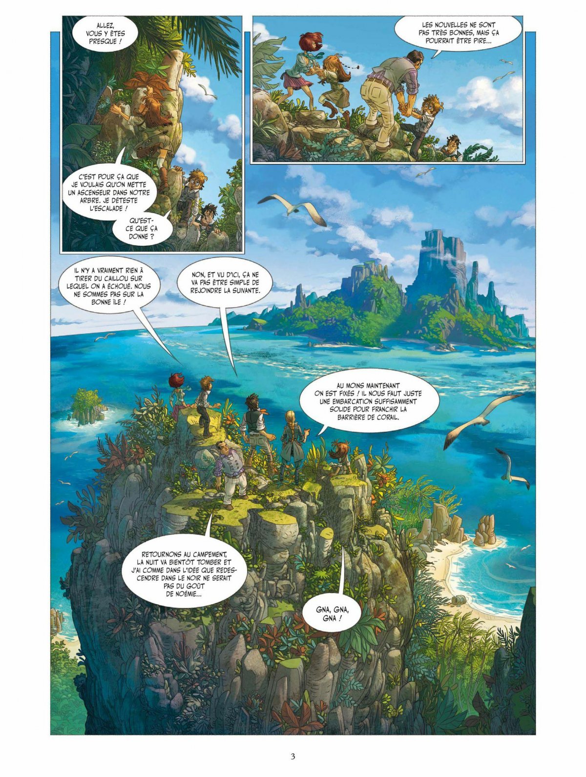 Seuls au monde ? Échoués sur une île déserte au beau milieu du Pacifique, Noémie, Émilien, Térence, Capone et les autres s’organisent comme de véritables robinsons. Mettant en commun leurs compétences, ils fabriquent un radeau à voile qui ne tarde malheureusement pas à partir en lambeaux avant qu’ils n’aient atteint leur objectif. Les intrépides cousins et Sigrid, l’espionne allemande, se retrouvent séparés du reste du groupe et rejoignent malgré tout une plage salvatrice. Là, ils découvrent, enfoui dans le sable, un mystérieux robot. Ils parviennent à le remettre en marche et celui-ci leur fait découvrir un peu mieux les mystères de l’île où ils ont échoué. Parmi les surprises qui les attendent, un refuge de pirate et son trésor, mais surtout une cité cachée qui semble appartenir à une civilisation disparue !Découvrez le nouvel album de cette grande série d’aventure steampunk plébiscitée par la critique et le public !
