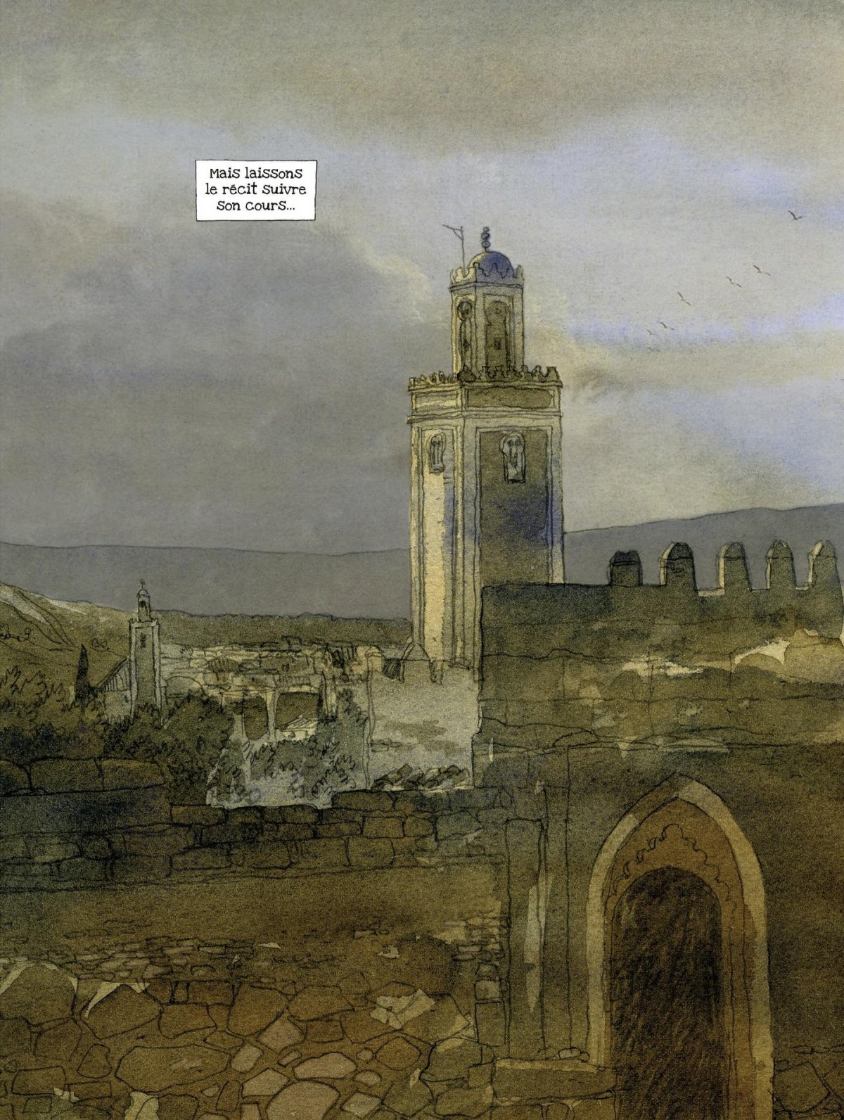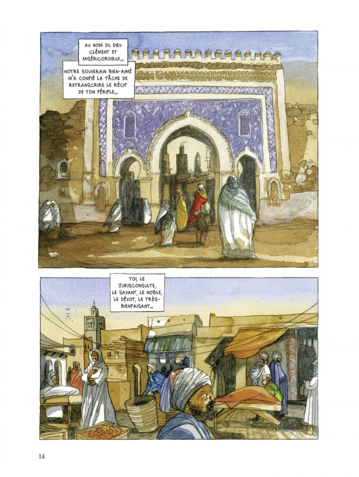 En 1998, le journaliste et écrivain marocain Lotfi Akalay avait déjà consacré un livre à l’explorateur, qu’il considère comme "le premier touriste du monde". Il y décortiquait les controverses autour du texte, en révélant les modalités de circulation dans le monde musulman de l’époque. La bande dessinée a ouvert de nouvelles portes à ses ambitions. La mise en abyme du récit original par le dessinateur du point de vue d’Ibn Battûta crée l’illusion d’un carnet de voyage, étape par étape, alternant croquis et planches à l’aquarelle. Un périple tout en lumière qui mêle le réalisme historique et l’onirisme du conte.