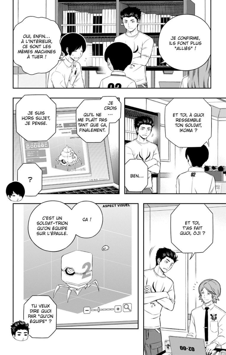 Alors que chaque équipe provisoire s’attelle à fabriquer des soldats-trions pour les utiliser en simulation de combat, le test en environnement clos continue. Avec ce nouvel exercice où la créativité est de mise, chaque groupe affine et met en pratique ses connaissances. Notamment l’unité Wakamura, dernière du classement, qui se lance au combat en suivant la stratégie de Hüs…
