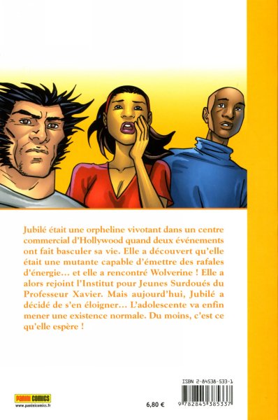 Jubilé était une orpheline vivotant dans un centre commercial d’Hollywood quand deux événements ont fait basculer sa vie. Elle a découvert qu’elle était une mutante capable d’émettre des rafales d’énergie. Et elle a rencontré Wolverine ! Elle a alors rejoint l’institut pour jeunes surdoués du Professeur Xavier. Mais aujourd’hui, Jubilé a décidé de s’en éloigner. L’adolescente va enfin mener une existence normale. Du moins, c’est ce qu’elle espère !.