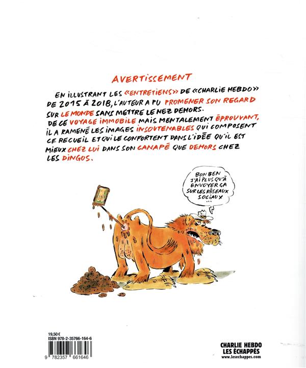 En illustrant les "Entretiens" de "Charlie Hebdo" de 2015 à 2018, l’auteur a pu promener son regard sur le monde sans mettre le nez dehors. De ce voyage immobile mais mentalement éprouvant, il a ramené les images insoutenables qui composent ce recueil et qui le confortent dans l’idée qu’il est mieux chez lui dans son canapé que dehors chez les dingos.