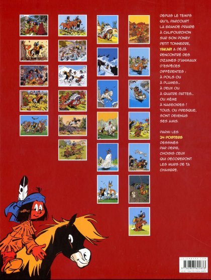 LE CADEAU A OFFRIR : L’ALBUM POSTERS "YAKARI" Depuis le temps qu’il parcourt la Grande Prairie à califourchon sur son poney Petit Tonnerre, Yakari a déjà rencontré des dizaines d’animaux d’espèces différentes : à poils ou à plumes, à deux ou à quatre pattes... ou même à nageoires ! Tous sont devenus des amis, dont il connaît le langage. Petit Tonnerre, les castors, Nanabozo le Grand Lapin, l’ourson Rayon-de-Miel, le Bison Blanc, Pilipiii le bélouga, l’élan Grande Ramure portant Arc-en-Ciel et Yakari dans ses bois, l’Oiseau de Neige survolant les bufs musqués... Quels posters, parmi les 24 que DERIB a dessinés et signés, les enfants choisiront-ils pour embellir leur environnement ?