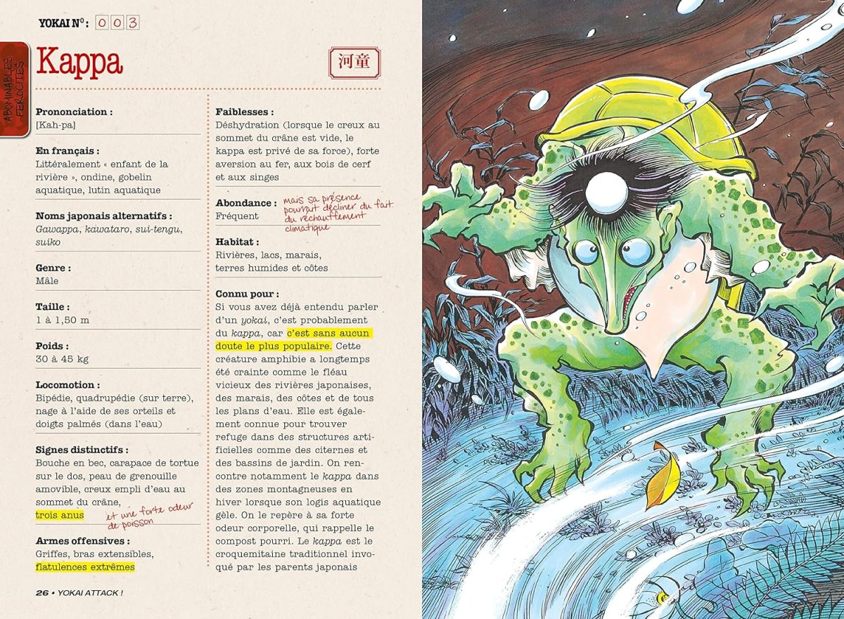 Près de 50 spécimens y sont présentés, décortiqués, et illustrés ! Ainsi, vous n’aurez ainsi aucun mal à reconnaître ceux que vous rencontrerez ! Devenez incollable en tournant ces pages ! Vous aurez en effet besoin de tout savoir si vous voulez sympathiser avec eux, vous en débarrasser, ou tout simplement briller en société ! Tout un florilège sur les origines des yokai à parcourir, forces et faiblesses des monstres japonais passées au crible.