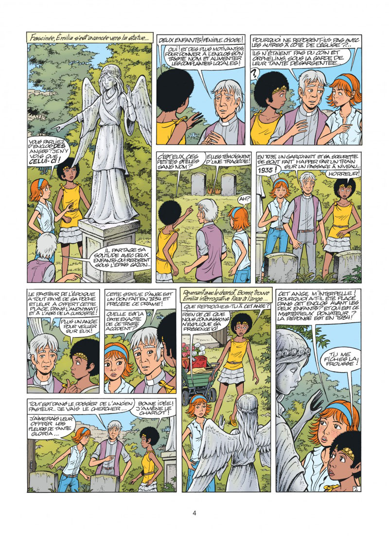 Nous sommes à l’ombre de l’église de Cornstone, près d’Édimbourg, où Émilia et Bonnie viennent fleurir la tombe de la tante Gloria. Le Pasteur Macduff leur raconte la triste histoire de ces deux jeunes orphelins tués dans un accident de train alors que la voiture qui les transportait était immobilisée sur un passage à niveaux. Ils reposent dans "l’enclos des anges", un lieu à l’écart et à l’abandon, où un ange veille sur eux. Étrangement, la statue, don d’un bienfaiteur anonyme, date de 1934, un an avant l’accident funeste. Bouleversée par cette tragédie, Émilia décide de demander à son arrière-grand-père (qui était vivant en 1935) de sauver la vie des deux enfants. Pour ce faire, une solution : utiliser la machine temporelle qui dort dans l’annexe. C’est ainsi qu’Émilia part pour 1935, laissant Bonnie désemparée. Cette dernière alerte Yoko qui part sur les traces de l’adolescente et qui tentera d’éviter la catastrophe ferroviaire...