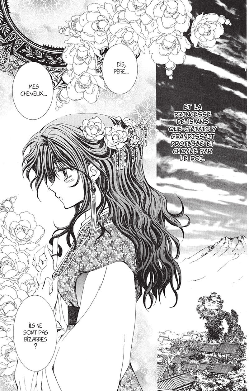 Yona, princesse du royaume de Kôka, a grandi dans l’insouciance, choyée par le roi et protégée par son garde du corps et ami d’enfance, le puissant guerrier, Hak. À l’approche de ses 16 ans, Yona est heureuse : son cousin et amour secret, Soo-won, vient lui rendre visite pour célébrer son anniversaire. Mais ce soir-là, une terrible tragédie survient et sa vie va être bouleversée à jamais !