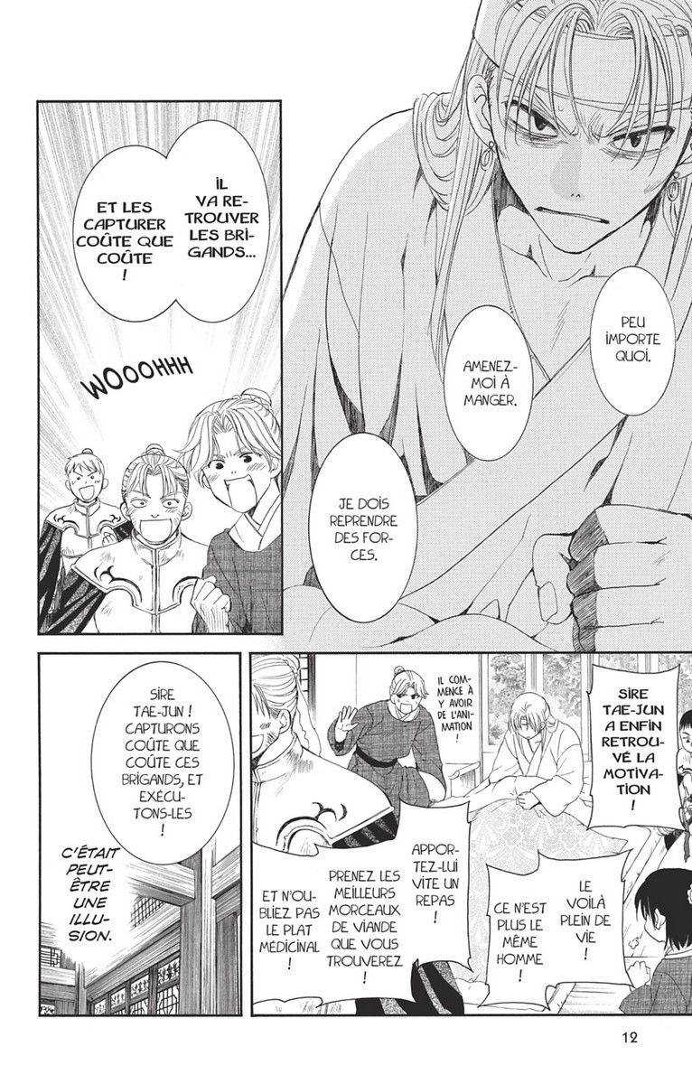 Yona et sa bande se font passer pour des brigands afin de protéger les villages de la tribu du feu des fonctionnaires tyranniques. De son côté, Kang Tae-jun, fils cadet du chef de la tribu du feu, est envoyé au village de Katan en expédition punitive afin de décimer les hors-la-loi. Là-bas, il entend la voix de Yona qu’il était pourtant censé avoir tuée ! Troublé, Tae-jun alerte par erreur les renforts alliés. Que va faire Yona face au danger qui menace le village ?!