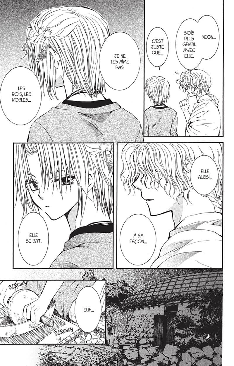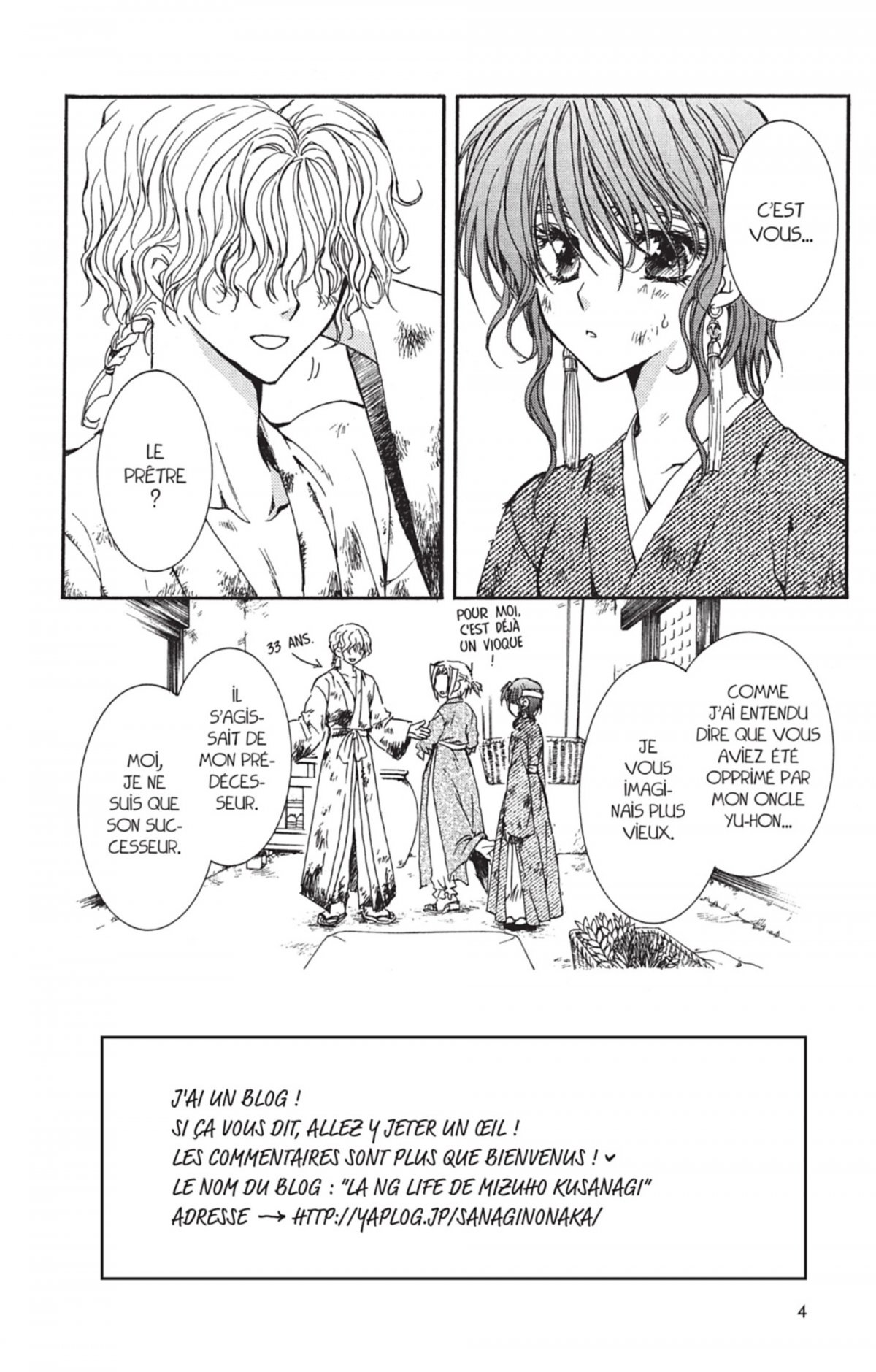 Suivant le conseil de Mundok, Yona et Hak partent à la recherche d’un prêtre ayant la capacité de prédire l’avenir. Mais, peu après leur départ de Fûga, ils sont attaqués par la tribu du feu ! Acculés par les soldats, ils tombent du haut d’une falaise et Hak est gravement blessé... Par chance, ils sont recueillis et soignés par deux étranges personnages... Yona va-t-elle trouver le prêtre ? Que lui réserve l’avenir qu’il va lui prédire ?