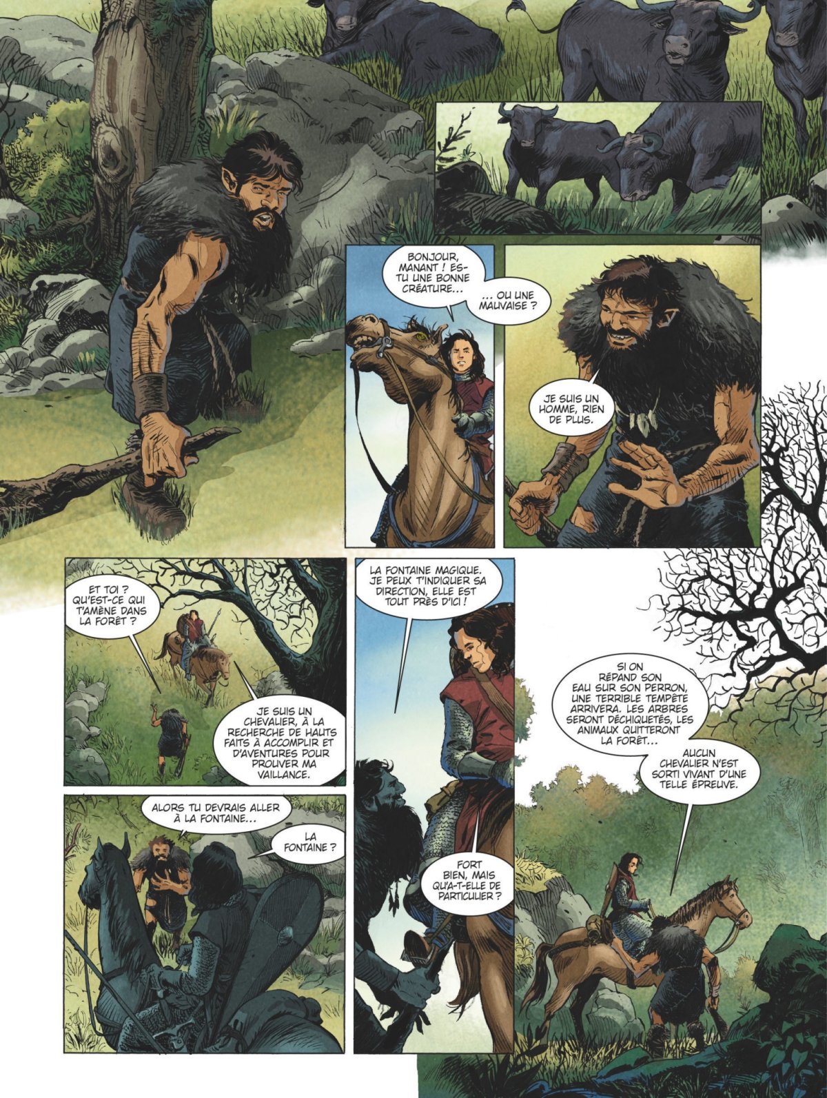 En tentant de venger le chevalier Calogrenant, Yvain blesse mortellement le seigneur Esclados le Roux lors d’un duel. Il est fait prisonnier sur-le-champ ! Le seigneur Esclados était un homme brave, protecteur d’une fontaine magique au coeur de la forêt ... Tandis qu’Yvain risque la mort, la servante Lunete va l’aider à s’échapper en lui confiant un anneau qui a le pouvoir de le rendre invisible ! Yvain est libre, mais son coeur ne l’est plus : durant sa captivité, il s’est épris de dame Laudine, la veuve du défunt seigneur. Mais comment parviendra-t-il à se faire aimer de cette jeune femme qui pleure la perte de son époux ? Et si Yvain lui fait allégeance en devenant à son tour protecteur de la fontaine, acceptera-t-elle sa compagnie ?
