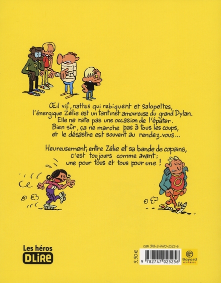Oeil vif, nattes qui rebiquent et salopettes, l’énergique Zélie est un tantinet amoureuse du grand Dylan. Elle ne rate pas une occasion de l’épater. Bien sûr, ça ne marche pas à tous les coups, et le désastre est souvent au rendez-vous. Heureusement entre Zélie et sa bande de copains, c’est toujours comme avant : une pour tous et tous pour une.