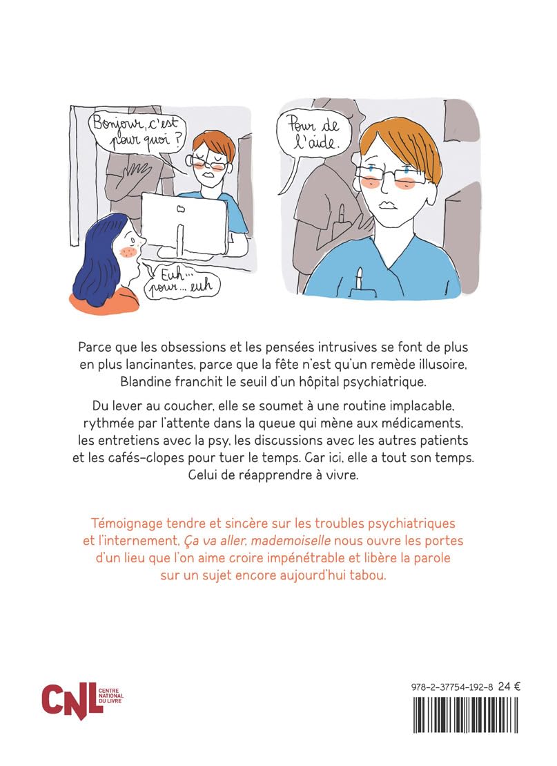 Je ne suis pas folle, vous savez ! Ca va aller, mademoiselle est le récit autobiographique d’un séjour en hôpital psychiatrique. On y suit Blandine, les circonstances de son admission, les rencontres qu’elle y fait, parfois drôles, parfois touchantes, souvent indélébiles. Du lever au coucher, elle se soumet à une routine implacable, rythmée par l’attente dans la queue qui mène aux médicaments, les entretiens avec la psy et les cafés-clopes pour tuer le temps.