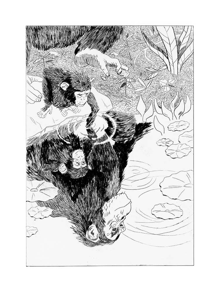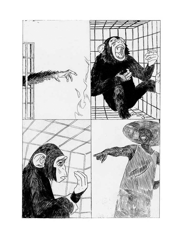 Chaque chapitre de Premiers Pas porte le nom d’une grande période de l’histoire de l’homme (Antiquité, Moyen-Age, Renaissance, etc), ce qui permet à l’évocation du destin de ce singe de résonner avec l’histoire de l’être humain dans sa totalité, conférant par là-même à l’oeuvre une dimension et une portée métaphorique riche